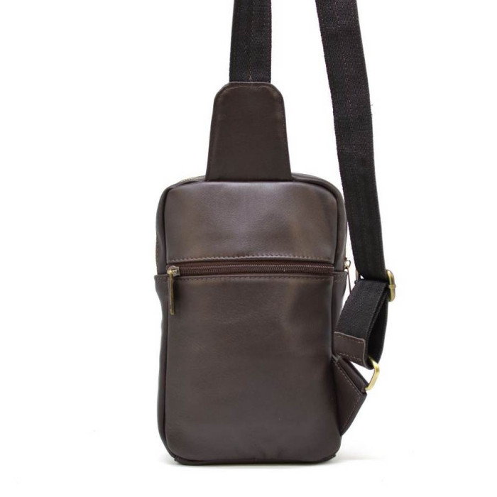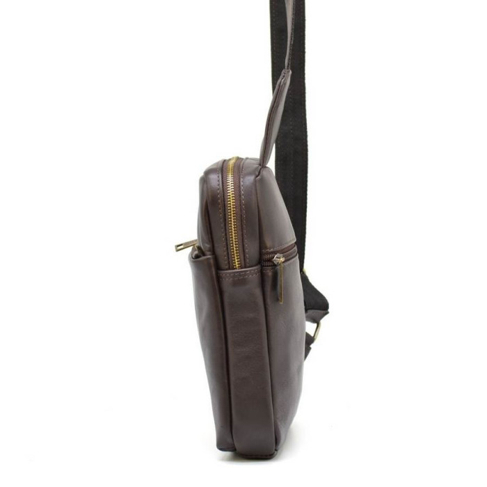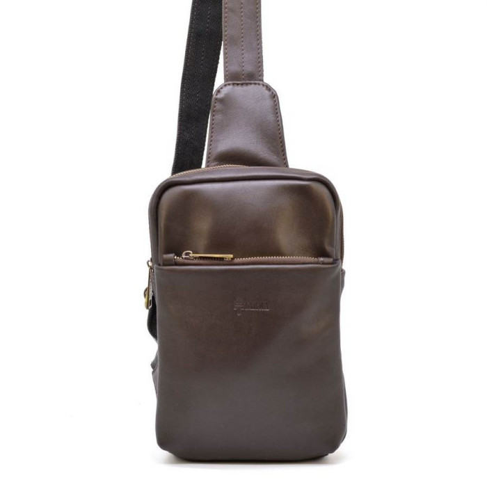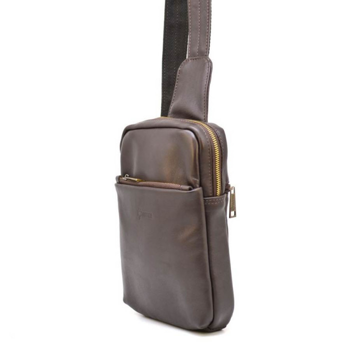 Міні-рюкзак з натуральної телячої шкіри на одне плече GC-0204-3md від бренду TARWA. Незамінний аксесуар в поїздках і просто на кожен день. Зручний для зберігання особистих документів, телефонів, портмоне, ключів і т.д. Виріб всередині має одне основне відділення з одним врізною кишенею на блискавці. На лицьовій і задній частинах рюкзака є кишені на блискавках. Рюкзак застібається за допомогою металевої блискавки. Якісна брендована фурнітура. Підклад щільний, тканинний. Документи формату А5 поміщаються в виріб. Модель міні-рюкзака - лаконічною прямокутної форми на одну шлею-ремінь через плече. Моношлейка - міцна зі шкіри, регулюється по довжині.