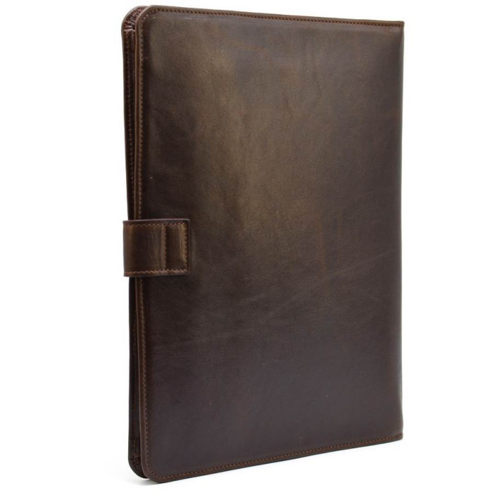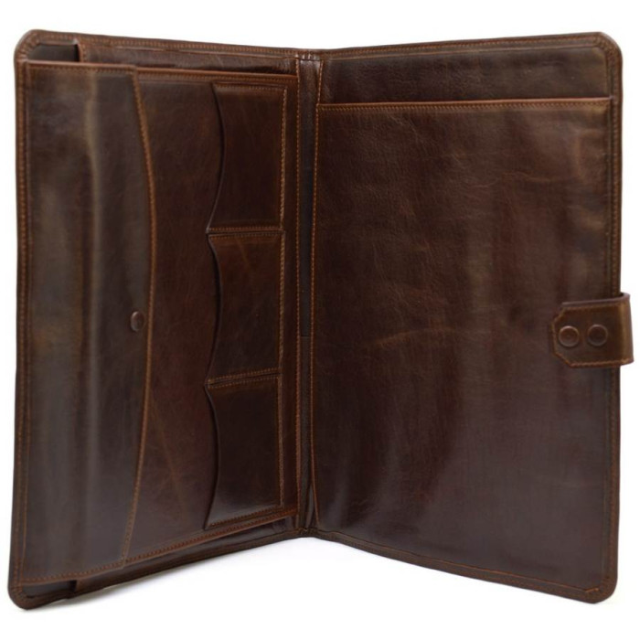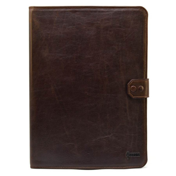 Папка ділова для документів формату A4 GC-0314-4lx, з натуральної телячої шкіри коричневого кольору, від українського бренду TARWA. Модель не тільки зручна, але і дуже стильна і статусна. Аксесуар застібається за допомогою шкіряного хлястика з кнопками (їх дві, для регулювання товщини папки, в залежності від того, наскільки багато паперів потрібно покласти). Всередині: три відділення-кишені для паперів, одне з них, саме об'ємне з клапаном і застібкою на кнопку. Також є три шкіряних маленьких кишеньки для пластикових карт або візиток, і одне кріплення для ручки, текстильний підкладка тільки всередині великих кишень.