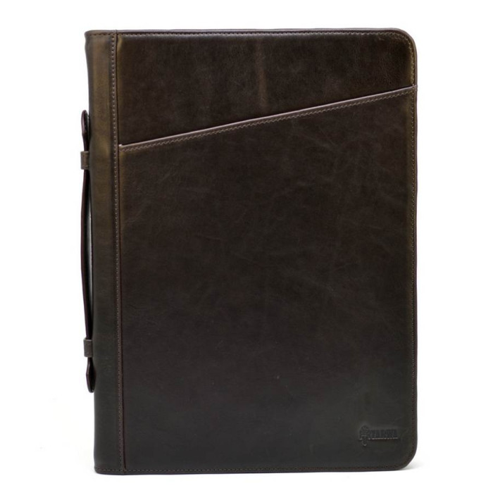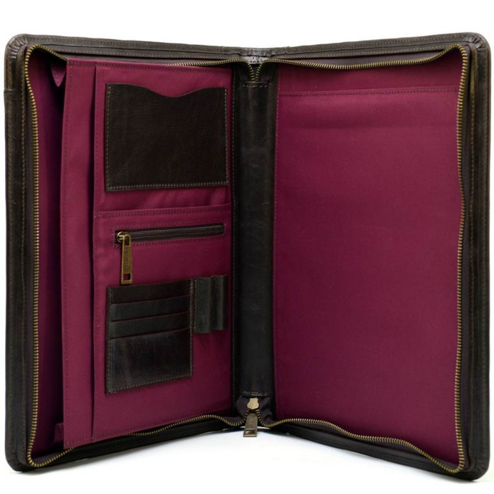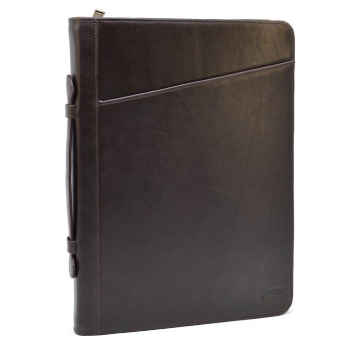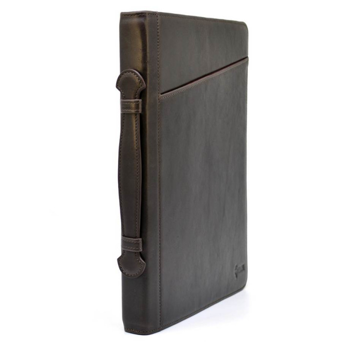 Ділова папка з ручкою, для документів A4 GC-1404-4lx, з натуральної телячої шкіри коричневого кольору, від українського бренду TARWA. Красива і практична і мега-функціональна модель, підкреслить статус свого власника. Аксесуар наділений шкіряною ручкою і застібається за допомогою блискавки, з трьох сторін. Всередині: чотири відділення-кишені для паперів, один врізна кишеня з блискавкою, один відкритий тканинний кишеню, один шкіряний відкритий, а також чотири кишені-слота під пластикові карти або візитки і два тримачі для ручок. Папка всередині повністю обшита міцним тканинним підкладів. На лицьовій стороні аксесуара розташовується косою, плоский кишеню, який також надає своєрідну родзинку виробу.