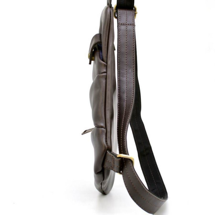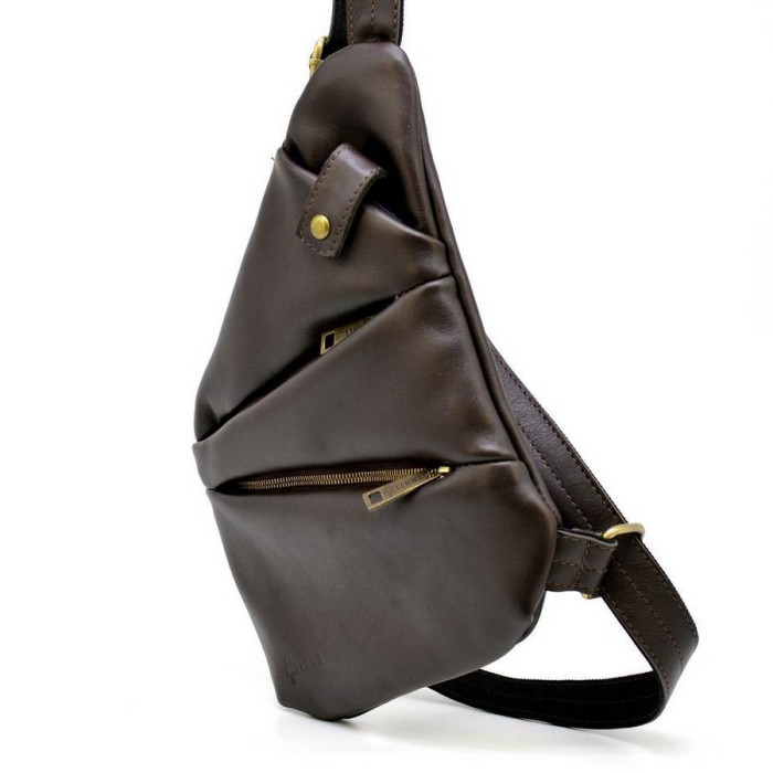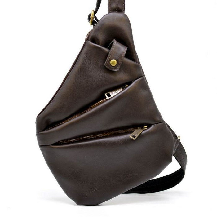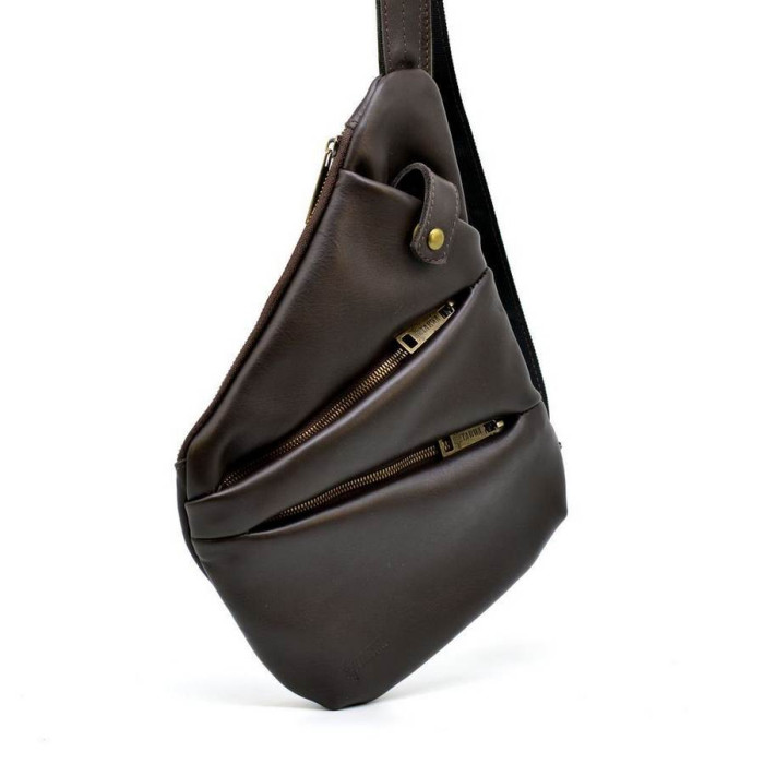 Чоловіча сумка-слінг з натуральної телячої шкіри GC-6402-3md коричневого кольору, від українського бренду TARWA. Виріб з незвичайним дизайном і максимальною функціональністю при носінні. Аксесуар стане в нагоді як в поїздках і подорожах, так і просто на кожен день. Складається з одного місткого відділення, застібається на блискавку. На лицьовій стороні сумки розташовані два горизонтальних кишені з блискавками, які служать ще і декором, в верхній частині є невеликий кишеньку з кнопкою, в який поміщається смартфон. Моно-шлейки виконана зі шкіри з текстильної основою, що запобігає розтягнення шлейки.