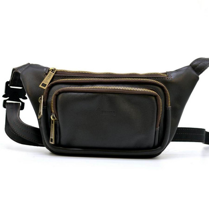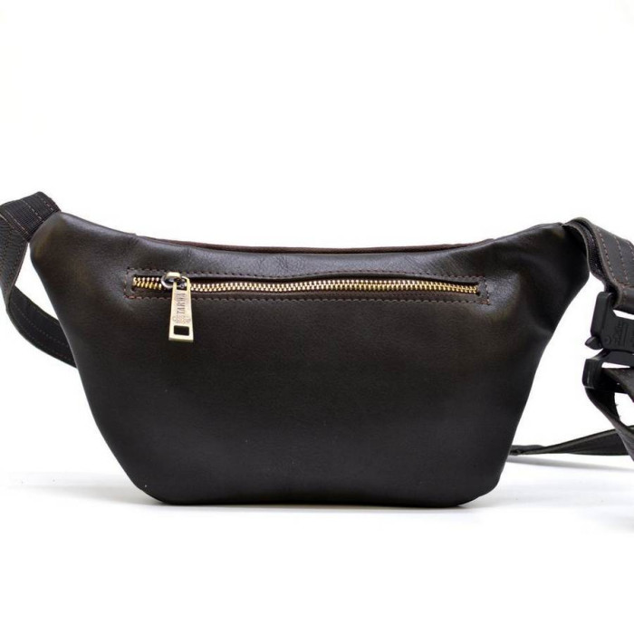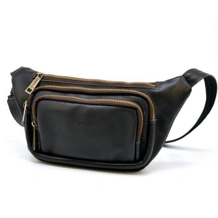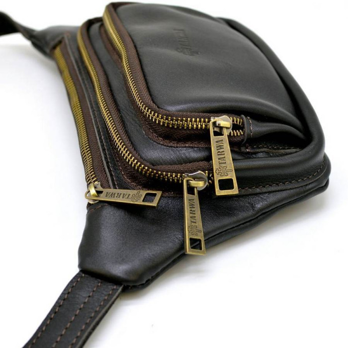Дуже зручна і функціональна напоясна сумка GC-8179-3md бренду TARWA, з натуральної телячої шкіри, колір коричневий. Виріб має основний відділ з кишенькою всередині. Також два об'ємних кишені, прямокутної форми, з блискавкою для зберігання телефону, гаманця, документів. На задній стороні є врізна кишеня з блискавкою. Модель має логотип бренду на лицьовій стороні. Ремінець виконаний зі шкіри і регулюється по довжині. Фурнітура металева, колір-бронза. Аксесуар досить компактний, хоча і місткий. Модель припаде до смаку не тільки чоловікам, але жінкам.