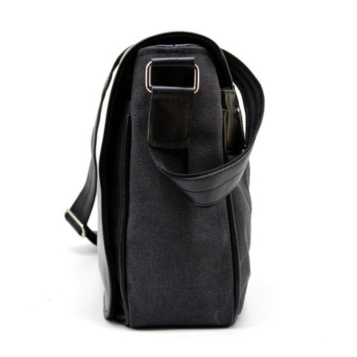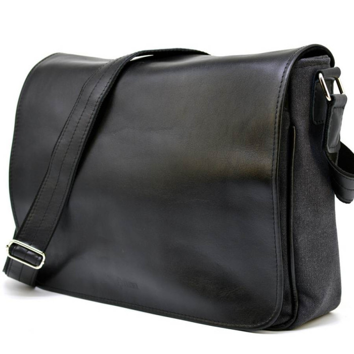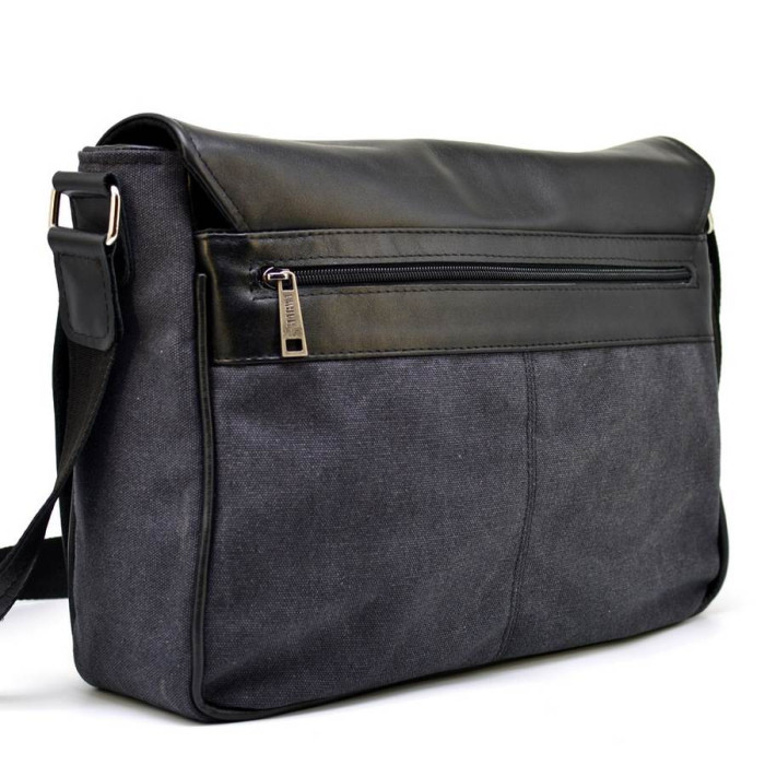 Чоловіча сумка через плече мікс натуральної шкіри і холщевої тканини канвас TARWA GG-1047-3md. Вміщує формат А4 і ноутбук до 14 "в основному відділенні. Виріб на одне містке відділення, з м'яким відсіком всередині для планшета з хлястиком і липучкою, також всередині є три кишені: один місткий виразний на блискавки і два відкритих для портмоне і телефону. Зовні на лицьовій стороні під клапаном є великий плоский врізна кишеня з блискавкою. Зовні на задній стороні - також врізна кишеня на блискавки. Сама сумка застібається на блискавку, а зверху накривається великим шкіряним клапаном, і безпосередньо в цій моделі виробники вирішили зробити клапан довше ніж основна частина сумки. Широкий ремінь через регульований ремінь зі шкіри, дозволяє комфортно носити аксесуар на плечі.