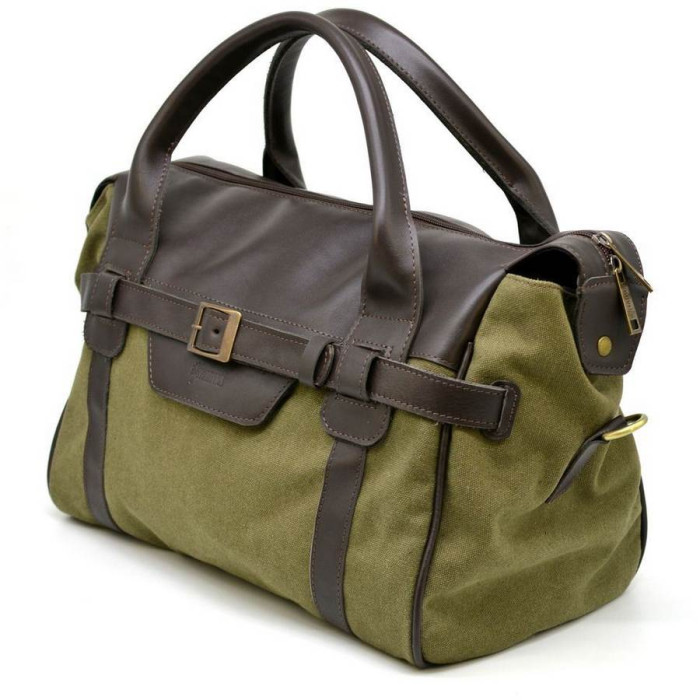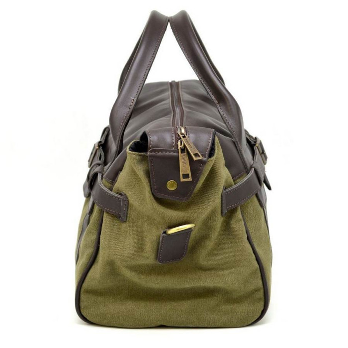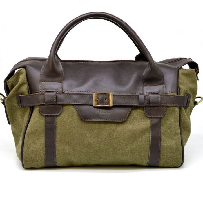 Універсальна сумка GH-7079-3md виконана з комбінації натуральної шкіри та текстилю Canvas, що істотно впливає на вагу вироби. Призначається для нетривалих подорожей, відряджень, а також для занять спортом. Завдяки своїм габаритам (40х30х22) підходить для ручної поклажі. Виріб виконаний з м'якої якісної шкіри та текстилю Canvas, з використанням металевої фурнітури і текстильної підкладки всередині. Укріплене дно сумки оснащено маленькими металевими ніжками для запобігання від подряпин шкіри вироби. Має одне велике відділення, в якому є два накладних відкритих кишені для телефону і портмоне, а також ще врізна велика кишеня, що застібається на блискавку, для цінних речей. аксесуар наділений двома короткими ручками для носіння в руці, але і плечевий знімний ремінь також присутній в комплекті. Обидві зовнішні сторони сумки прикрашає декоративний шкіряний ремінець з пряжкою.