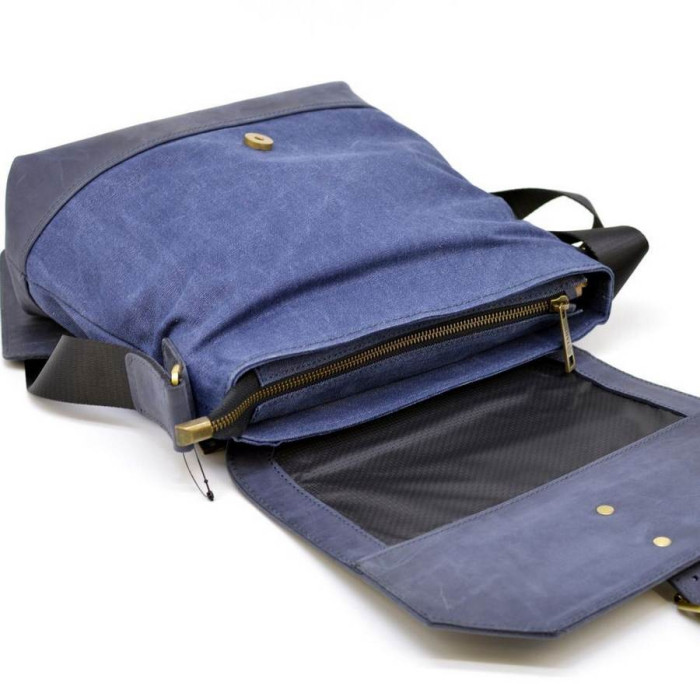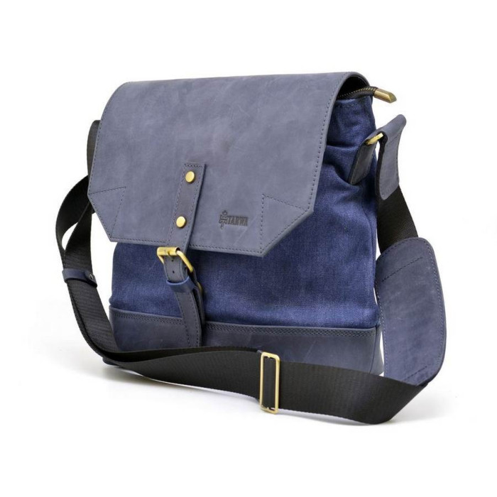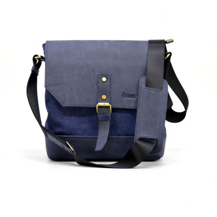 Сумка-месенджер через плече мікс тканини Canvas і натуральної шкіри Crazy Horse KK-1307-4lx від українського бренду TARWA. Компактна, але містка модель, стане в нагоді для повсякденного носіння. Виріб має два відділення, розділених між собою великою кишенею-перегородкою з блискавкою. Всередині є два великих відкритих кишені і одна врізна з блискавкою. Сумка застібається на блискавку і зверху накривається шкіряним клапаном. У виробі використана якісна фурнітура в бронзовому кольорі і щільний тканинний підкладка. Дизайн лицьоваой сторіни сумки доповнює шкіряний ремінець на клапані з фурнітурою, а також красива гравірування з логотипом бренду. Аксесуар має довгий текстильний регульований ремінь з шкіряним наплічником для носіння сумки на плечі.