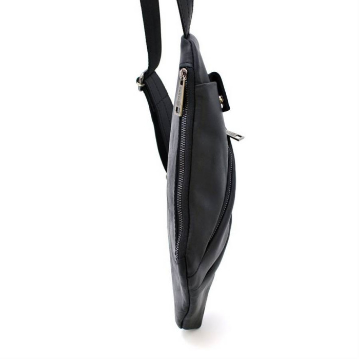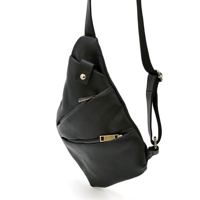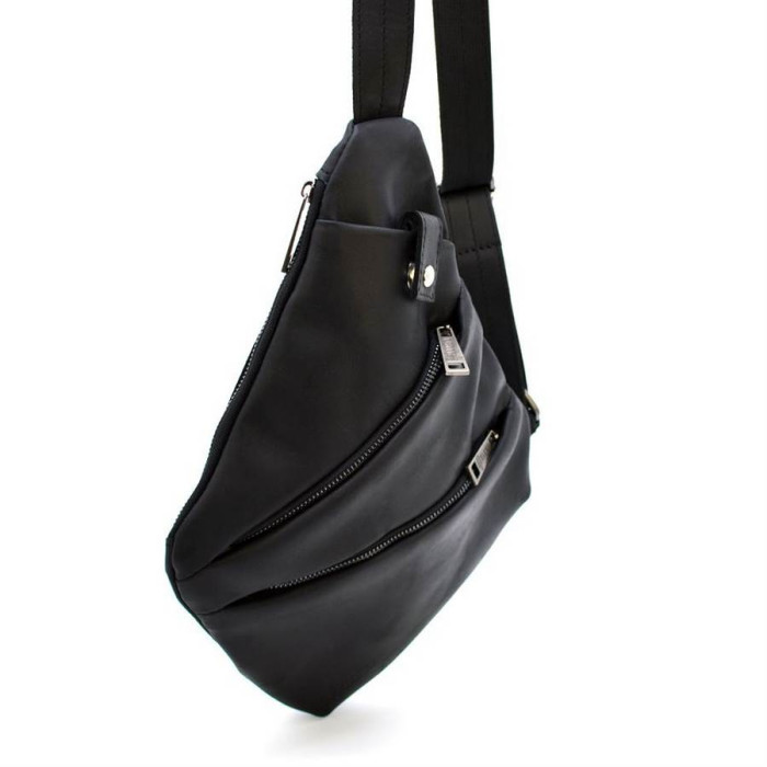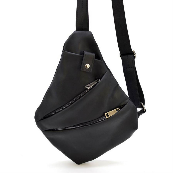 Чоловіча сумка через плече, з натуральної матовою телячої шкіри, чорного кольору RA-6402-3md, від українського бренду TARWA. Модель буде корисна в поїздках і подорожах. Виріб виконаний повністю їх шкіри, всередині тканинний підкладка. Має одне містке відділення, що застібається на блискавку. Лицьову сторону сумки прикрашають два горизонтальних кишені з блискавками, також зверху є маленька кишенька з магнітною кнопкою. Дану модель можна позиціонувати і як міні-рюкзак на одне плече. Моно-шлейки виконана зі шкіри з текстильної основою. Металева фурнітура та блискавки. Аксесуар незвичайної форми, і максимальною функціональністю при носінні.