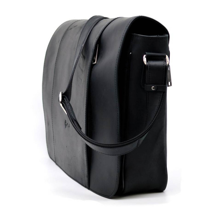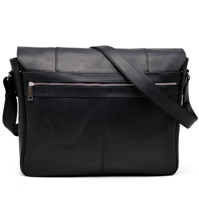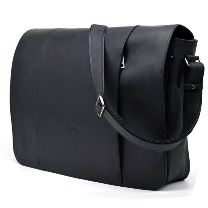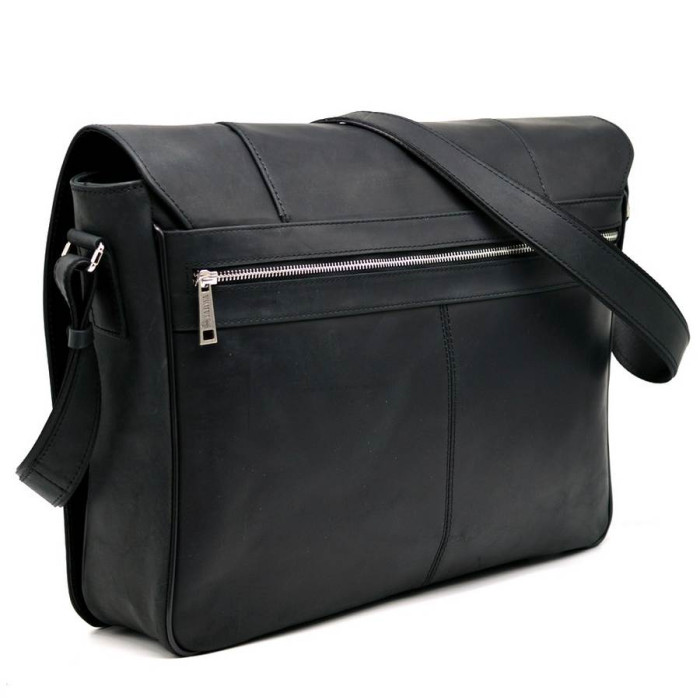 Шкіряна містка сумка на плече для ноутбука 15-17 "TARWA RA-7339-4lx, від українського виробника. Модель призначена для зберігання і перенесення великого ноутбука. Лицьова сторона аксесуара прикрита шкіряним клапаном на двох магнітних кнопках з врізним вертикальним кишенею на блискавці. Під клапаном також розташована кишеня на блискавці. Задня частина сумки має горизонтальну врізну кишені на блискавки. Виріб на одне відділення, в якому є щільна перегородка для ноутбука або документів формату А4. Внутрішні додаткові відкриті кишені для телефону, портмоне, і ще один великий кишені на блискавки. фурнітура вироби якісна і надійна. Внутрішнє оздоблення - високоякісний текстиль і шкіра. ремінь на плече виконаний зі шкіри, і має регулювання довжини.