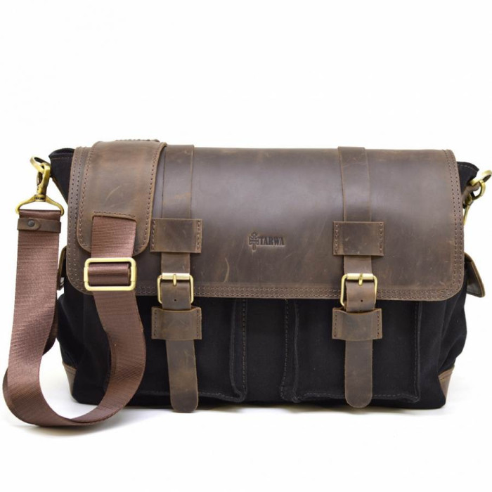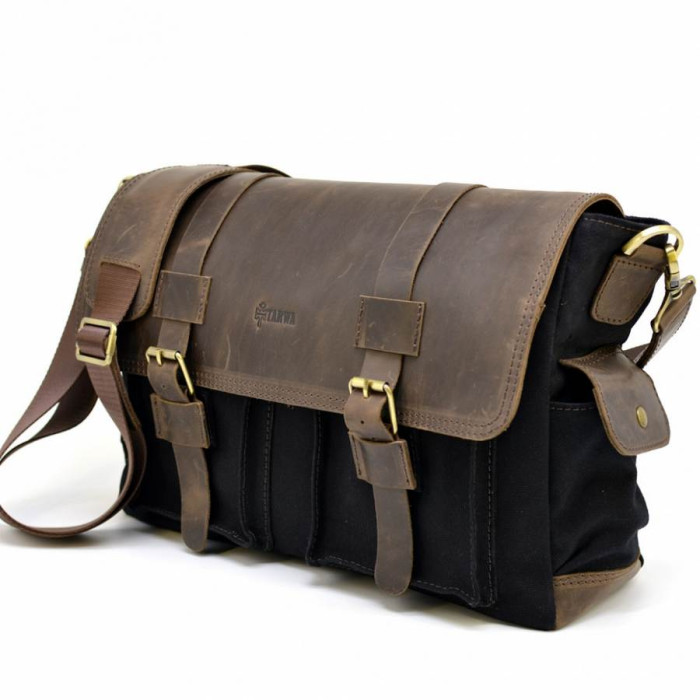 Сумка через плече з парусини і шкіри крейзі RAc-6690-4lx для чоловіків від українського бренду Tarwa. Висока якість, функціональність і особливий стиль все це з легкістю поєднує в собі дана модель, яка стане незамінним аксесуаром на кожен день і в поїздки. Виріб має один основний відділ, в якому розташовується ущільнений відсік для невеликого ноутбука, планшета або документів. Вміщує формат А4. Також, всередині, на інший стінці є дві відкритих кишені для телефону і портмоне, і ще один на блискавки. На задній стороні сумки є кріплення для ременя. Лицьову сторону аксесуара прикрашають два об'ємних кишені, прикритих шкіряним клапаном з ремінцями на магнітах і логотипом бренду. Торцеві сторони вироби оснащені двома кишенями з клапанами зі шкіри, що додають сумці особливий шарм.
