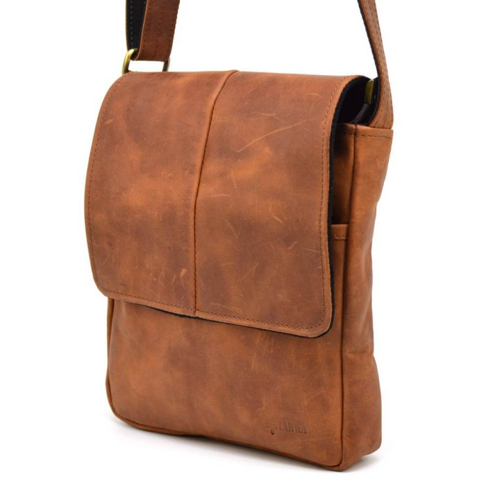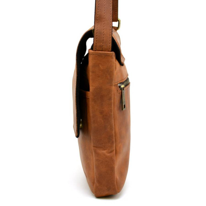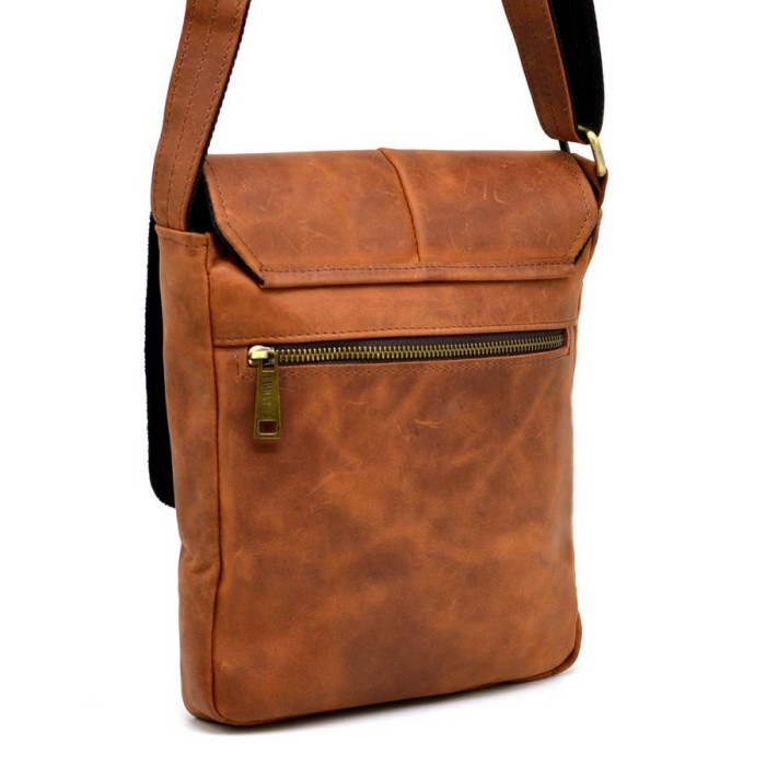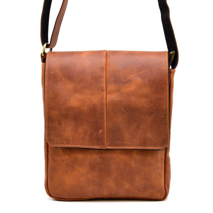 Цікава чоловіча сумка через плече, з натуральної кінської шкіри, вищої якості, з клапаном руда RB-1301-3md, від українського бренду TARWA. Модель може вміщати документи формату А5, планшет. Виріб складається з одного відділення, застібається на блискавку, і зверху накривається шкіряним клапаном, з магнітною кнопкою. Усередині розташовуються кишені: дві відкритих кишені і одна врізна на блискавки, для дрібних предметів. На лицьовій стороні сумки ховаються під клапаном дві кишені на блискавках. На задній стороні є врізна кишеня на блискавки. Аксесуар зручно носити на плечі, завдяки плечевого ременя, який можна відрегулювати по довжині.