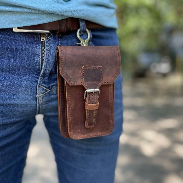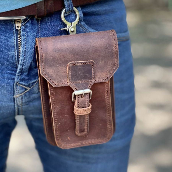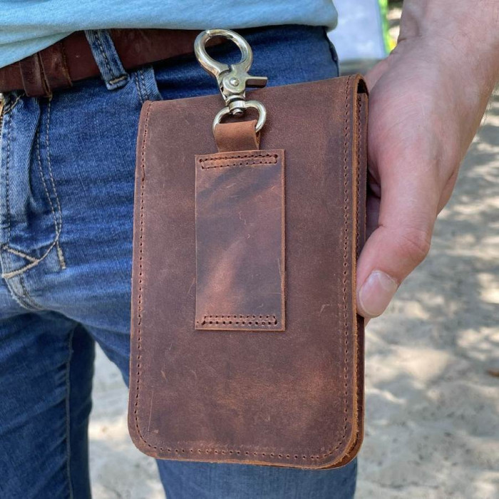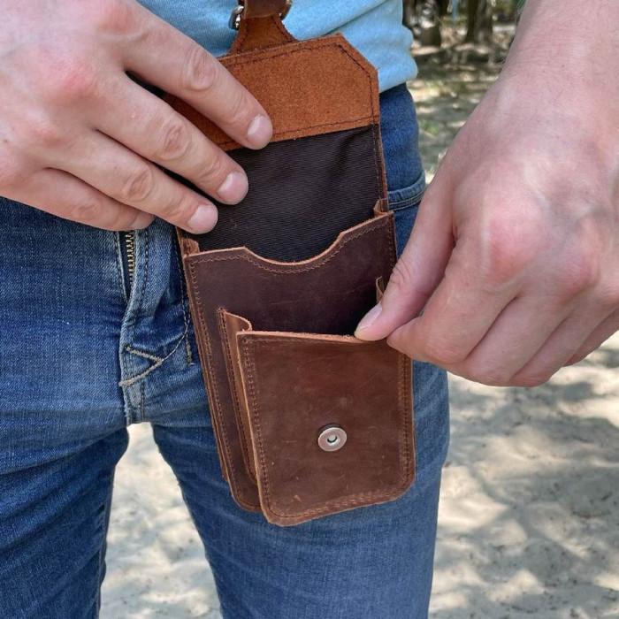 Аксесуар за допомогою карабіна можна прикріпити до вашого одягу, наприклад штанів. Сумка-чохол на пояс виконана з натурального матеріалу, тому Ви можете бути впевнені у високій якості та довгостроковості товару. Чохол має 2 внутрішні відсіки, клямку, карабін.