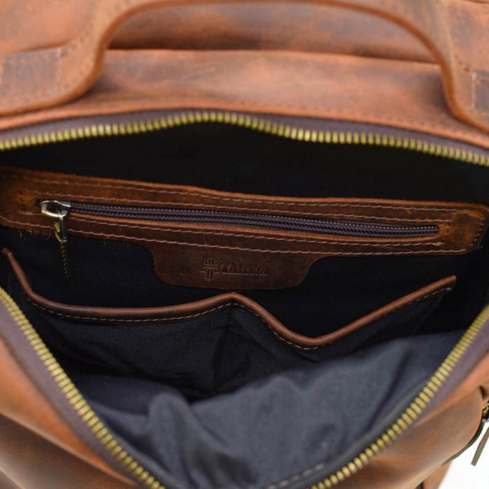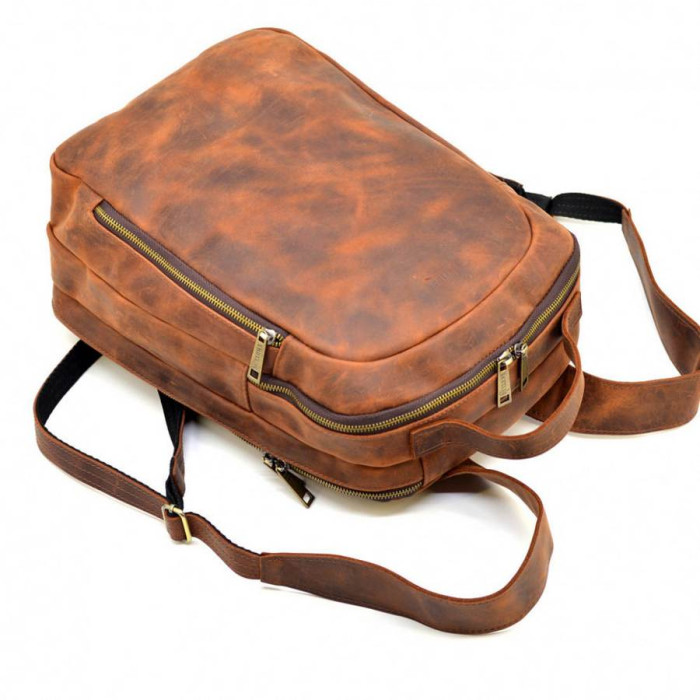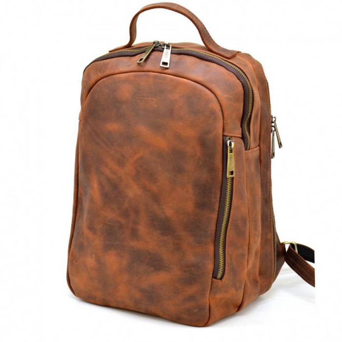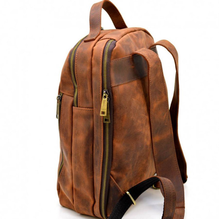 шкіри Crazy hourse. Колір світло-коричневий, вінтажний. Всередині обшитий міцною тканиною Опис: два автономні відділення, всередині потайна бічна кишеня на блискавці. Зовні на тильній та передній стороні рюкзака: кишені на блискавці. Сумісний з лептопами до 16" включно. Зручні широкі шлейки, міцна коротка шкіряна ручка.
