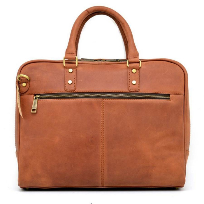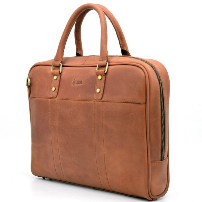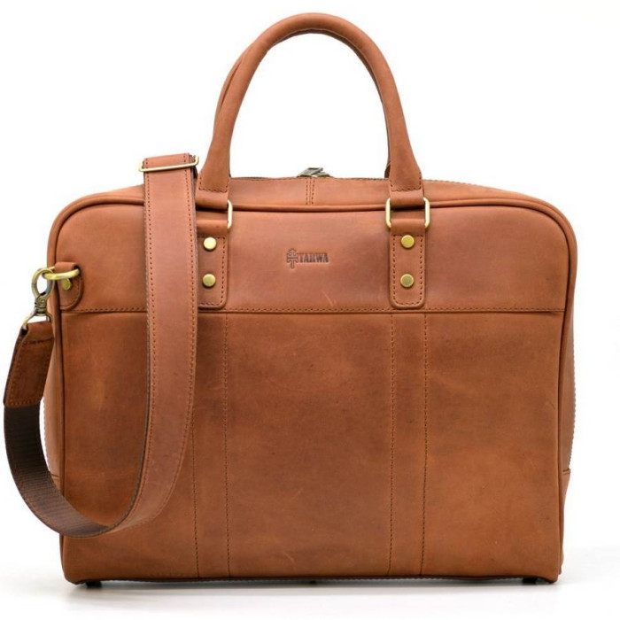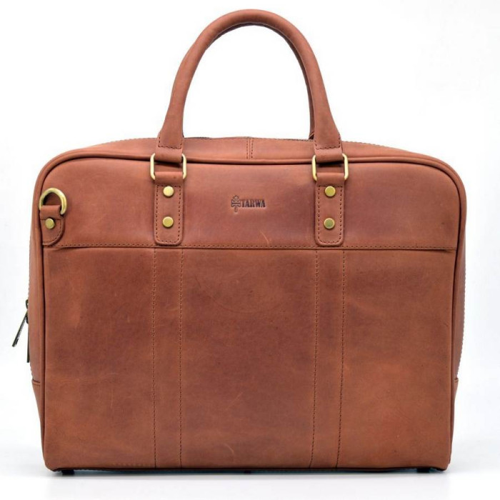 Шкіряна сумка в красивому цегельному кольорі RB-4765-4lx TARWA має дві маленькі ручки для перенесення в руці і знімний шкіряний ремінь на плече. Модель універсальна і підійде як чоловікам, так і жінкам. Виріб складається з одного основного відділу, усередині якого розташовується ущільнений відсік, що застібається на хлястик з липучкою, для зберігання ноутбука до 16 "або документів А4. Також, всередині є велика врізна кишеня з блискавкою для цінних речей. На одній з зовнішніх сторін є кишеня на блискавки. Аксесуар має строгий дизайн, без зайвих виступаючих кишень і ремінців, виконаний з високоякісної матовою кінської шкіри, з використанням металевої фурнітури і щільною текстильної підкладки. Зручна і практична модель для роботи або навчання.