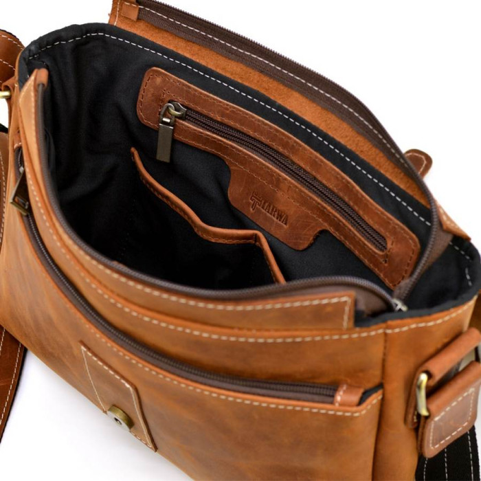 Стильна сумка месенджер унісекс від бренду TARWA. Якісна натуральна кінська шкіра крейзі хорс. Захоплюючий дизайн в рудому виконанні. Дуже добре підходить для щоденного використання. Зовнішня частина мессенждери закривається на шкіряний клапан на металевому замку. На задній частині сумки, відділення на блискавці під невеликим клапаном. Шкіряний ремінь через плече, який регулюється. Красива фурнітура, колір - бронза. Внутрішня частина сумки має в собі: