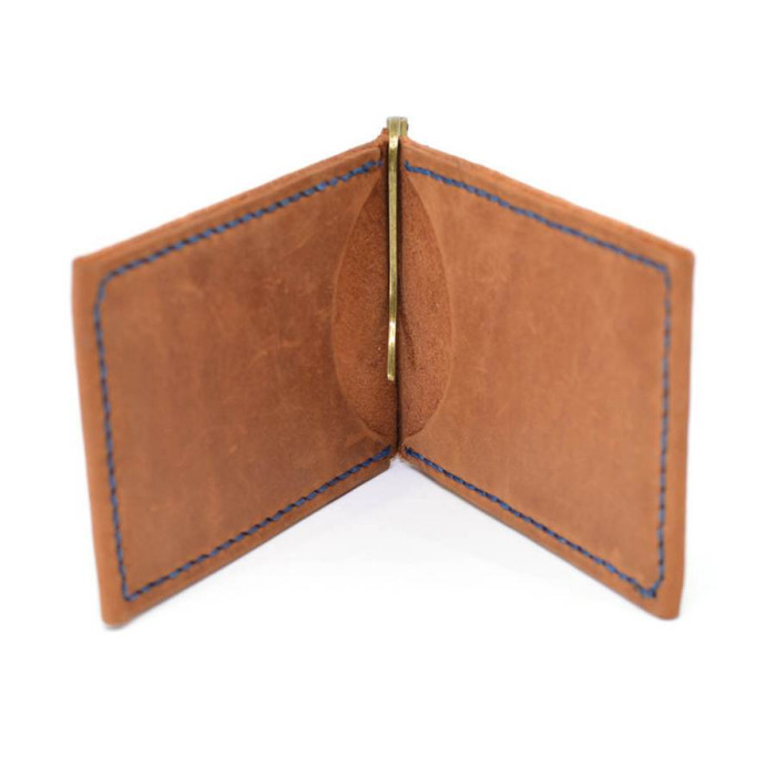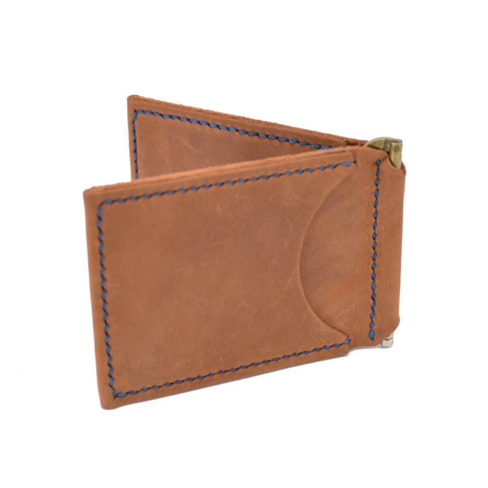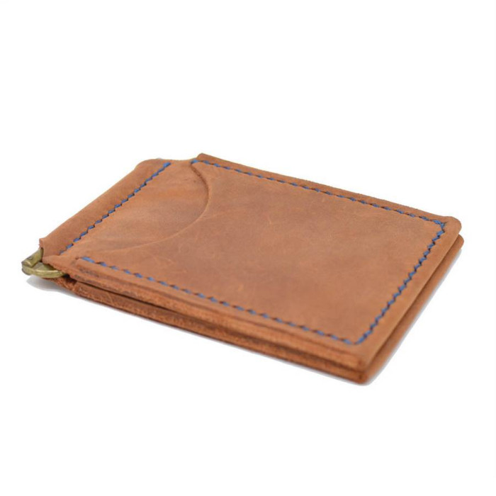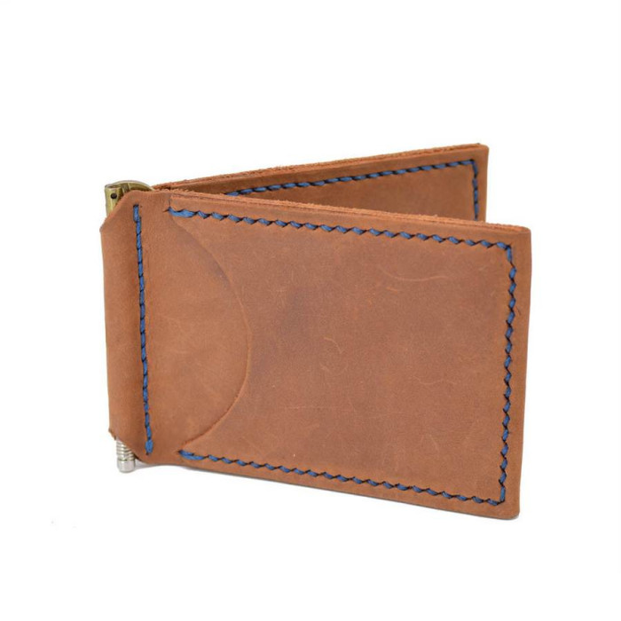 Стильний затискач для купюр від українського виробника TARWA. Аксесуар виготовлений із натуральної шкіри Crazy horse, ручної роботи, прошитий синьою ниткою. Виріб виконаний повністю вручну. Ця модель TARWA всередині має затискач для купюр і 4 відділення для карт. Розмір затиску дозволяє легко поміститися в кишеню. Розмір 11,5 см на 8 см.