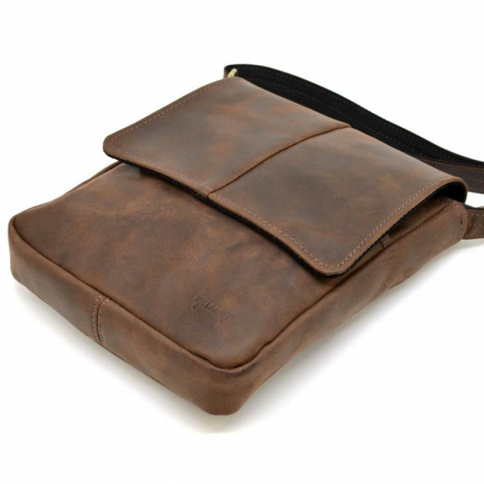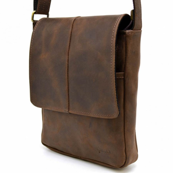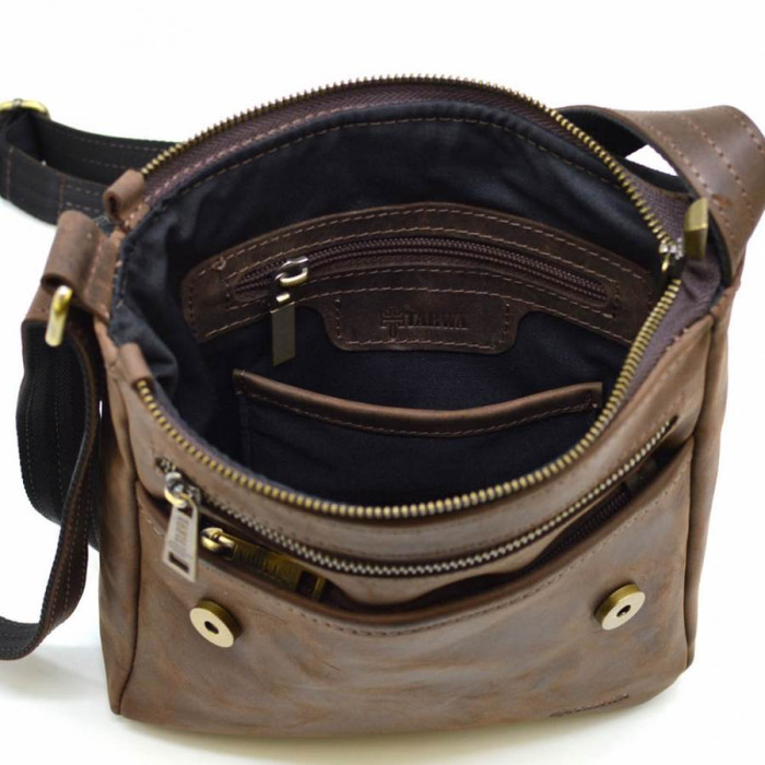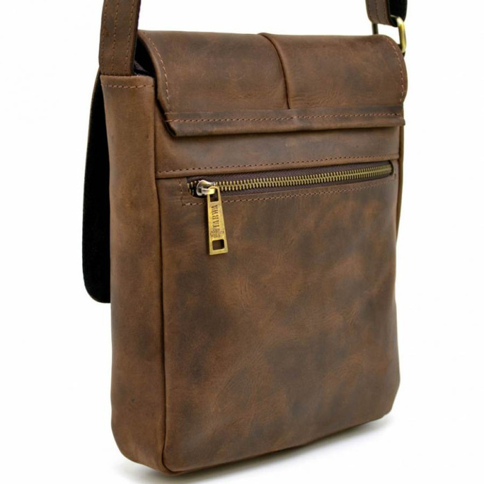 Красива, компактна чоловіча сумка через плече RC-1301-3md від українського бренду TARWA. Модель може вміщати документи формату А5, планшет. Виріб виготовлено з натуральної кінської шкіри, екстра-класу. Сумка складається з одного відділення, застібається на блискавку, і зверху накривається шкіряним клапаном, з магнітною кнопкою. Всередині є кишені: дві відкритих кишені і одна врізна на блискавки, для дрібних предметів. На лицьовій стороні сумки розташовуються дві кишені з блискавками, вони ховаються під клапаном. На задній стороні є врізна кишеня на блискавки. Аксесуар зручно носити на плечі завдяки регулюється плечевого ременя.