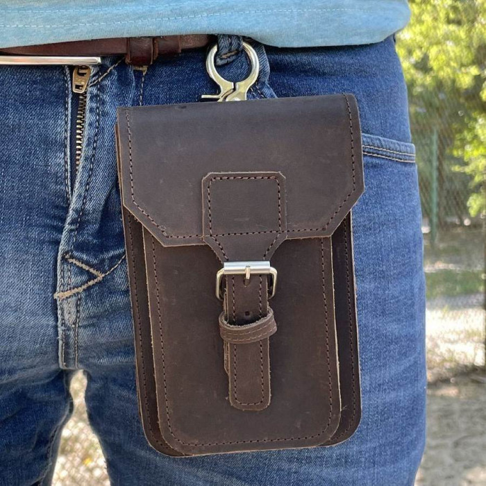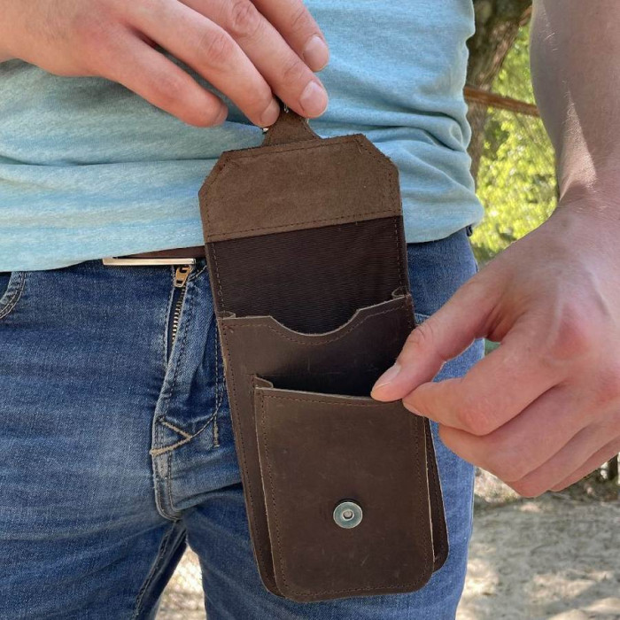 Аксесуар за допомогою карабіна можна прикріпити до вашого одягу, наприклад штанів. Сумка-чохол на пояс виконана з натурального матеріалу, тому Ви можете бути впевнені у високій якості та довгостроковості товару. Чохол має 2 внутрішні відсіки, клямку, карабін.
