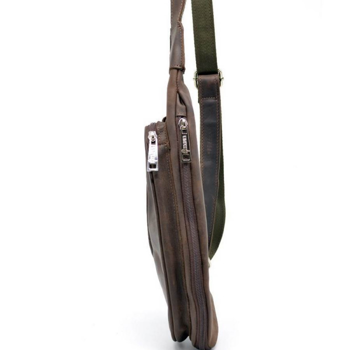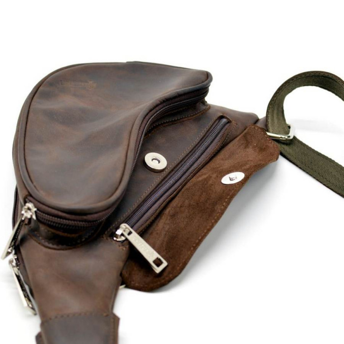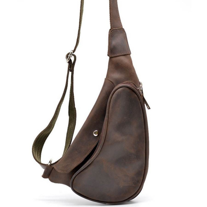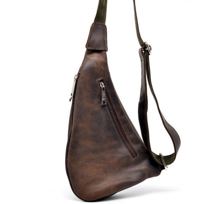 Рюкзак на одне плече ізоготовлен з натуральної шкіри Crazy Horse. Стильний, модний і зручний аксесуар на кожен день, а також для прогулянок і подорожей. Допоможе зберегти ваші цінні речі і завжди бути "мобільним", Виріб має різноманіттям кишень різної форми та об'ємом, що дає більше можливостей для застосування. Регульована по довжині шкіряна шлейки. Усередині щільний текстиль підкладка.