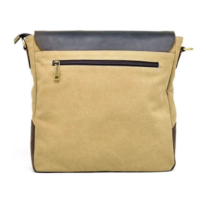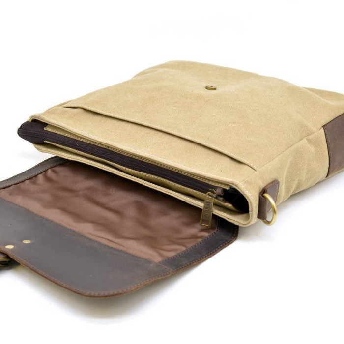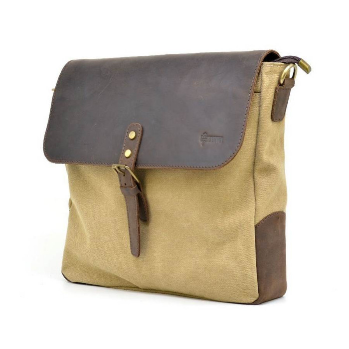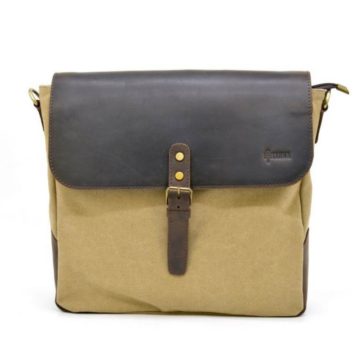 Сумка чоловіча через плече парусина + шкіра теляча RC-6600-4lx TARWA. Зручний варіант для роботи, навчання або поїздок. Вміщує формат А4. Виріб на одного відділення з внутрішнім ущільненим відсіком на липучці для планшета або документів. Всередині є два відкритих невеликих кишені для телефону і портмоне, ще містка кишеня на блискавці для цінних предметів. На задній стороні сумки розташовуються два величезних плоских кишені: один на блискавці, і другий на магнітній кнопці. А також під клапаном ще є великий відкритий кишеню. Аксесуар застібається на блискавку і зверху накривається шкіряним клапаном з ремінцем і магнітом. Кути денця сумки укріплені шкірою. На шкіряному клапані, який застібається на магнітну кнопку і прикрашений хлястиком, присутній гравірування з логотипом бренду. У комплектацію входить знімний плечевий ремінь.