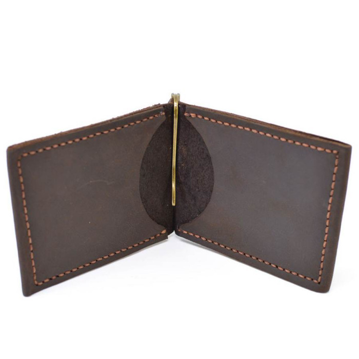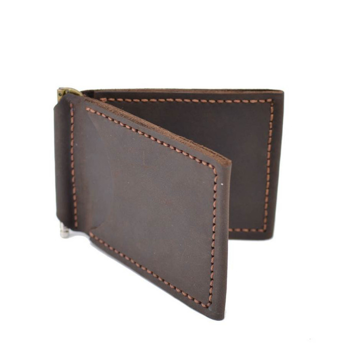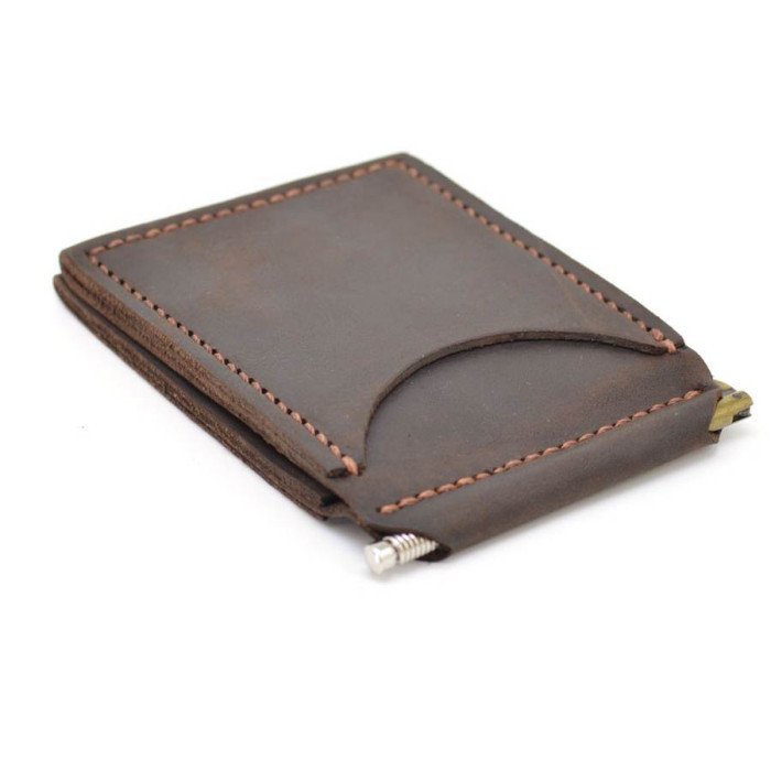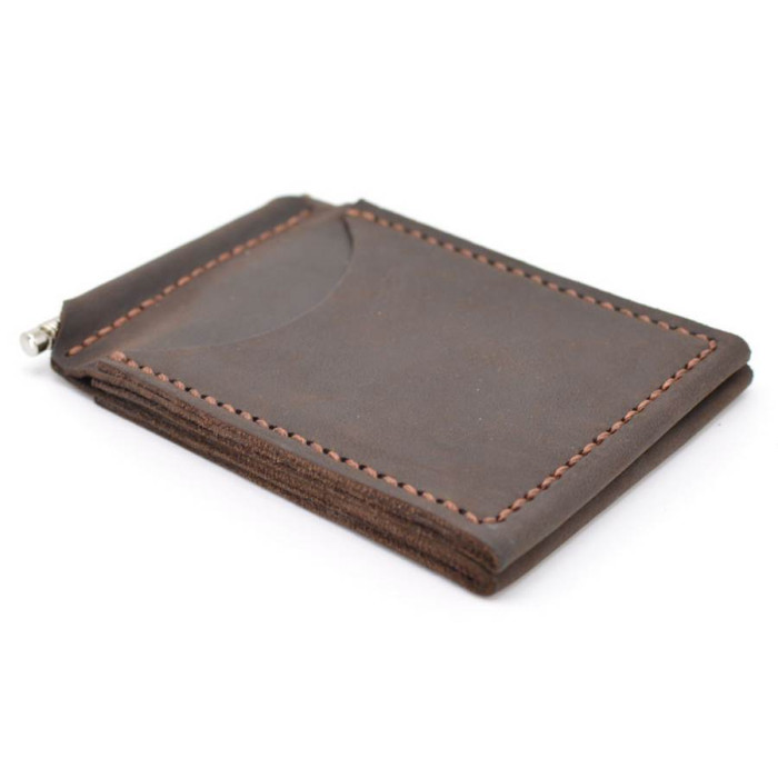 Стильний та дуже практичний затискач для купюр, "ручної роботи" від українського виробника TARWA. Виконаний з якісної натуральної шкіри у коричневому кольорі. Усередині є затискач для грошей, 4 відділення під картки. Дана модель має компактність. Виріб виготовлено повністю вручну, надійний та стильний варіант. Такий аксесуар може стати чудовим подарунком.