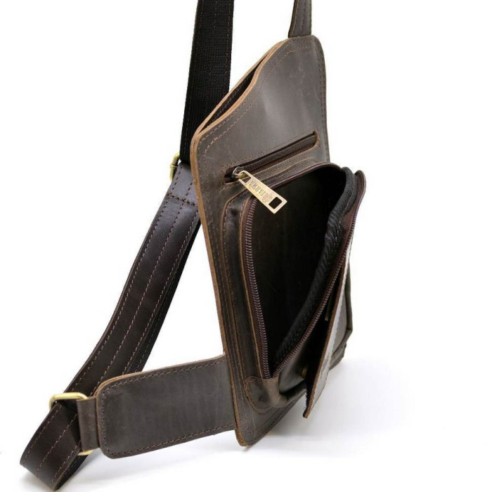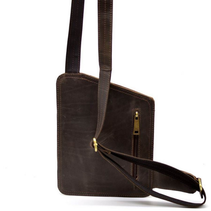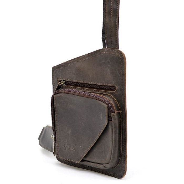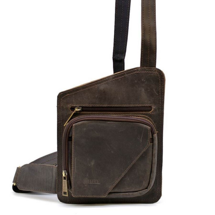 Чоловіча сумка через плече, кобура RCv-232-3md, з натуральної шкіри Crazy Horse. Аксесуар на кожен день для найнеобхідніших речей, гаджетів і документів. Завдяки своїй плоскій формі, може одягатися під верхній одяг і бути максимально невидимої. Складається з основного плоского відділення на магнітній кнопці, 3-х кишень з лицьового боку, всі застібаються на блискавку, і ще один на задній стороні сумки. Підкладка виготовлена з якісного щільного текстилю. Сучасний, нестандартний, асиметричний крій. Регульований ремінь зі шкіри та текстилю.