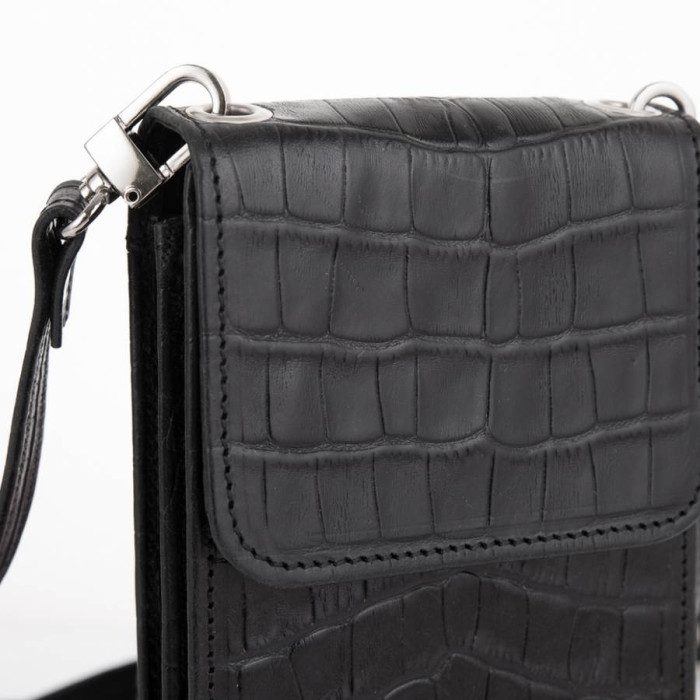 Сумка-чохол складається з двох загальних відділень, які закриваються клапаном, всередині яких вшиті кишеньки для банківських карт, з тильного боку присутній врізна кишеня на блискавки. У виробі використовується якісна фурнітура, в срібному кольорі. Ремінець регулюється по довжині.