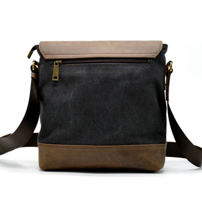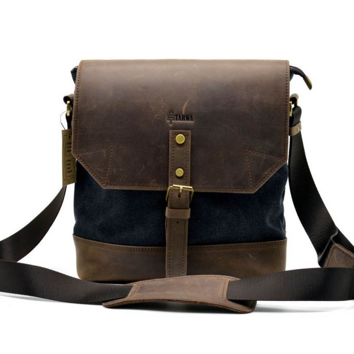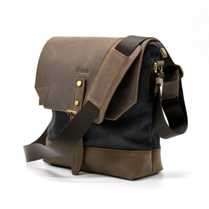 Сумка-месенджер виготовлена з поєднання натуральної шкіри (Crazy Horse) і текстильної тканини (Canvas). Дана комбінація надає сумці презентабельний вигляд і зручність при носінні. Всередині: два відділення, розділених між собою великою кишенею для планшета і інших речей. Сумка застібається на блискавку і накривається клапаном. Якісна фурнітура в бронзовому кольорі.
