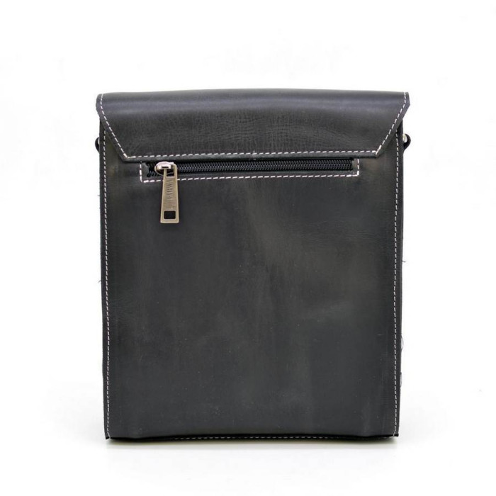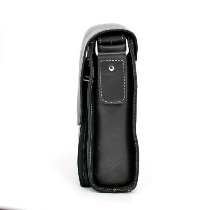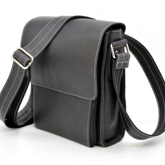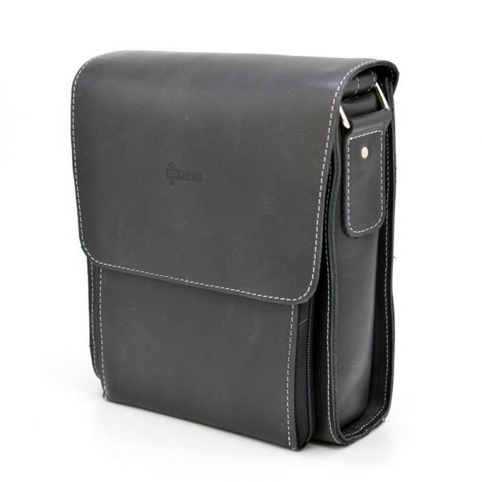 Сумка чоловіча з натуральної телячої шкіри чорного кольору з білою контрастною рядком RG-3027-3md від українського бренду TARWA. Виріб складається з одного відділення, всередині якого є кишеня на блискавці для документів і ще один накладної відкритий кишеню для телефону, наприклад. Сумка застібається на блискавку і зверху накривається клапаном з магнітною кнопкою. На клапані присутня гравірування з логотипом бренду. На лицьовій стороні, під клапаном розташовується зручний відкидний містка кишеня на блискавці з внутрішніми шкіряними відсіками для пластикових карт або візиток. На задній стороні виробу знаходиться ще один кишені на блискавки. Сумочка оснащена шкіряним, який регулюється по довжині ремінцем з текстильної основою, яка захищає ремінь від розтягування.