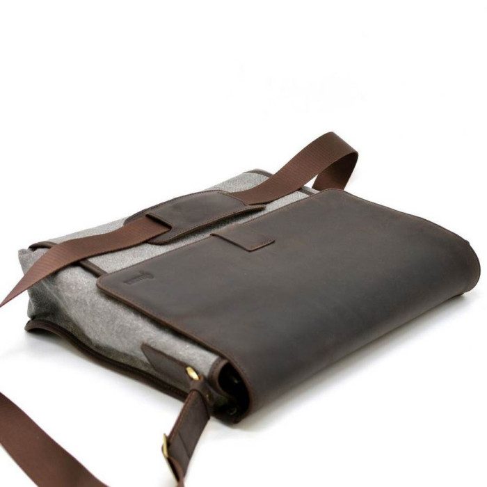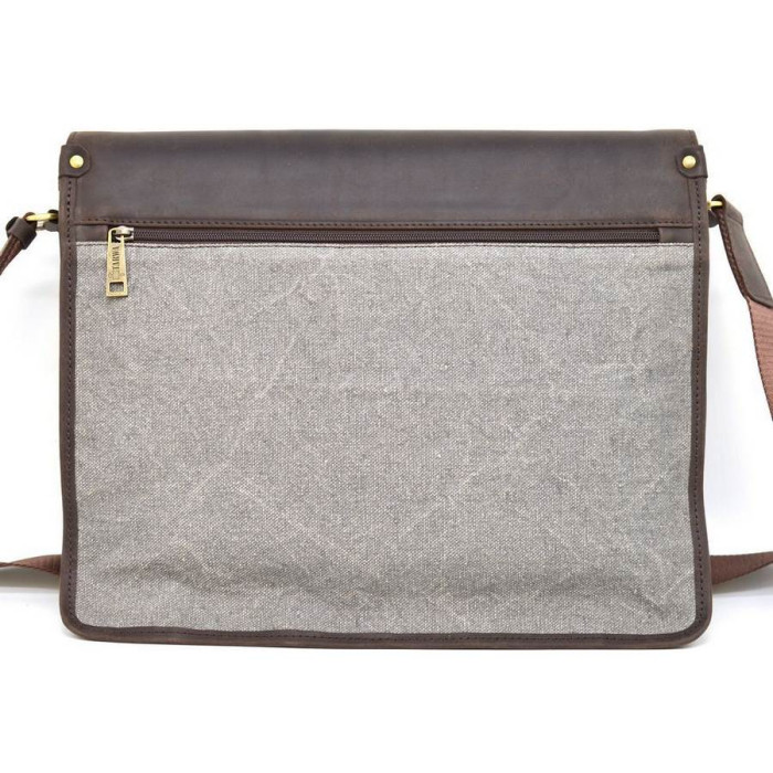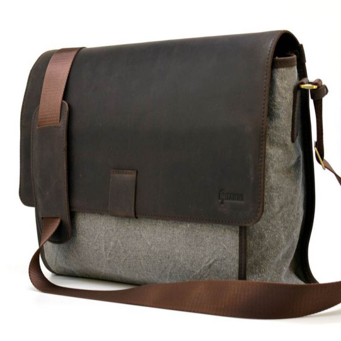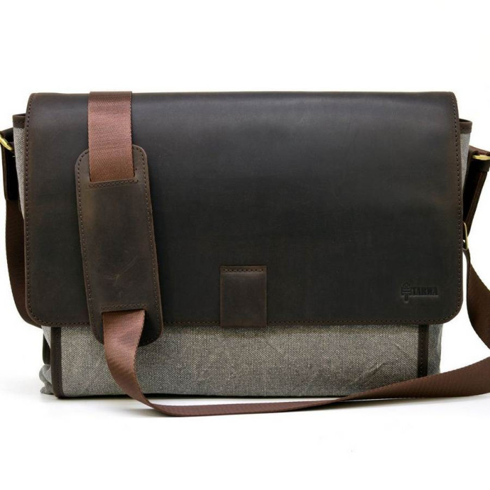 Чоловіча сумка через плече, мікс тканини канвас і натуральної шкіри, RG-3940-4lx від українського бренду TARWA. Вміщує документи формату А4 і ноутбук до 14 ". Прекрасний варіант для роботи і навчання. Виріб виконаний з якісних матеріалів, і має одне основне відділення, усередині якого розташовується кишеню відсік на всю ширину сумки, а також відкритий кишеню трохи менше для смартфона і врізна кишеня з блискавкою. Сама сумка застібається на блискавку і зверху прикривається до серередіни вироби, Шкіряним клапаном на магніті. Під клапаном є дуже зручний плоский кишеню. На задній стороні аксесуара є врізна кишеня з блискавкою. Сумка оснащена текстильним регульованим ремінцем зі шкіряним наплічником.