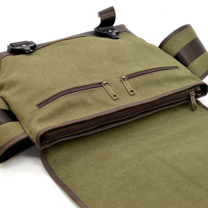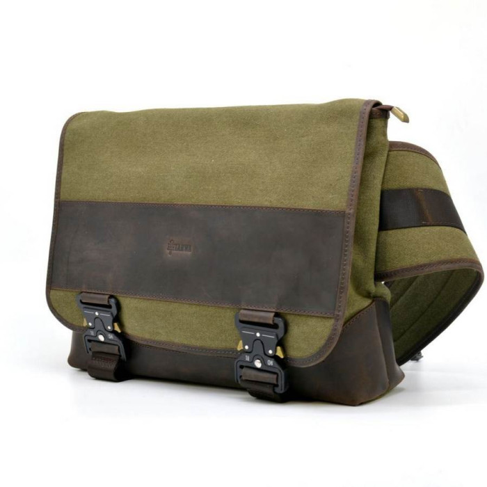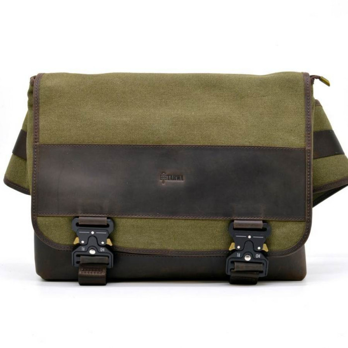 Модна і суперстильна чоловіча сумка від українського бренду TARWA RH-1737-4lx виготовлена в сучасному напрямку модних тенденцій. Еклюзівний дизайн, поєднання шкіри Crazy Horse і текстилю Canvas, надійна і міцна фурнітура будуть привабливі власнику такого аксесуара. Прямокутна форма виробу дозволяє носити ноутбук до 14 дюймів, документи А4, особисті необхідні для вас речі. Середній кишені на блискавки розділяє основне відділення ще на 2 незавімих великих відділення. З внутрішньої сторони знаходиться 1 велика кишеня на блискавки. Основне відділення закривається на блискавку, а зверху накидається клапан, що фіксується на 2 фастексах. З лицьової частини сумки під клапаном розташовані 2 невеликих кишені для телефону та інших дрібниць. З тильного боку сумки також є велика кишеня на блискавки. Широкі ремені надають незвичайний і стильний вигляд, застібаються на застібку-фастекс.