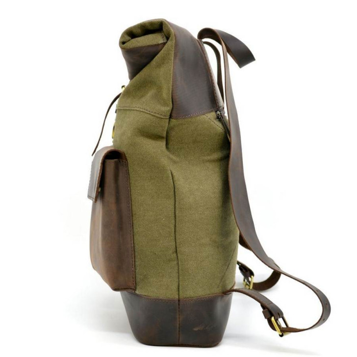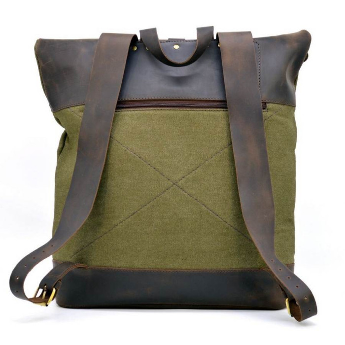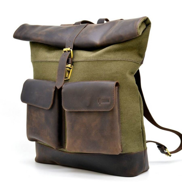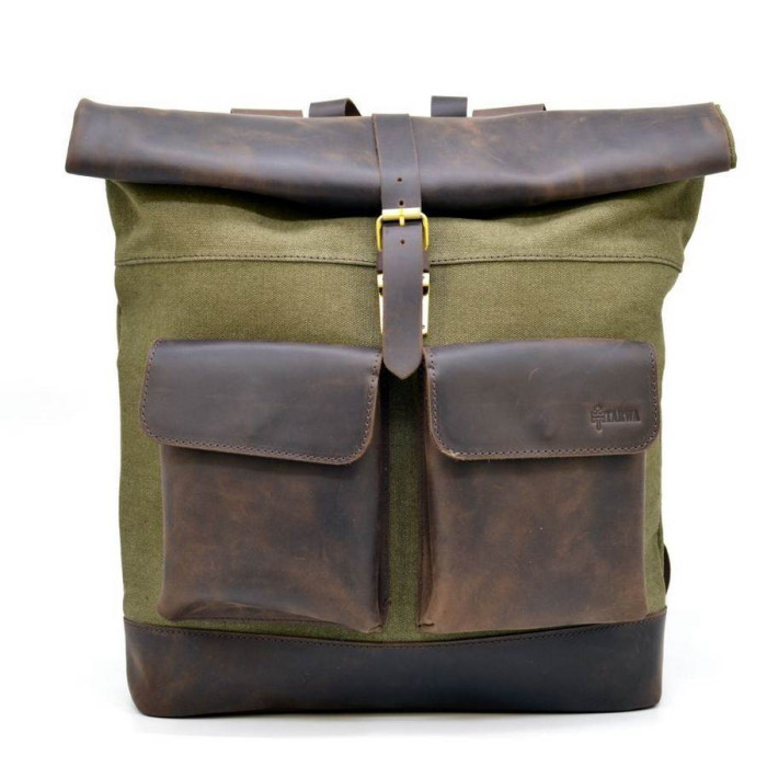 Оригінальний roll-up міської рюкзак в стилі "Лофт", мікс з парусини і шкіри RH-3462-4lx від українського бренду TARWA. Виріб складається з одного великого відділення, а всередині розташовується ущільнений відсік для ноутбука, що застібається на липучку і велика кишеня з блискавкою. Сам рюкзак, верхня його частина трохи загортається і застібається за допомогою шкіряного ремінця з металевої портфельної застібкою, причому сама застібка прикрита хлястиком. Неповторний, злегка брутальний, дизайн аксесуара доповнюють два об'ємних кишені з клапанами на магнітах. Наплічні шлейки досить широкі, завдяки чому навантаження буде більш рівномірно розподілятися на спину. Спинка рюкзака оформлена стеганой щільною тканиною, що надає виробу практичність і зручність в носінні.