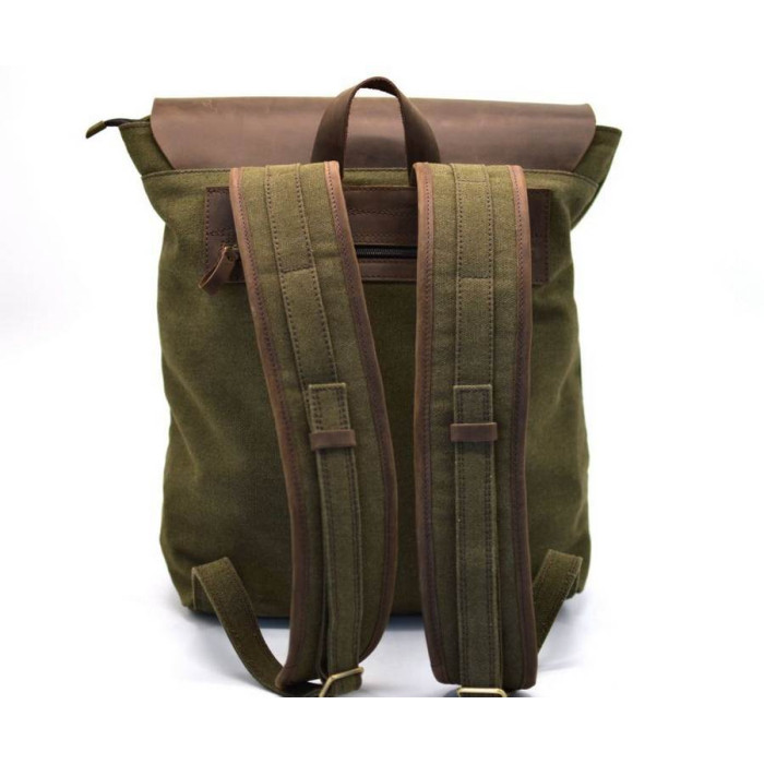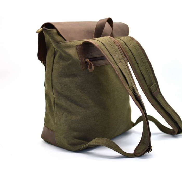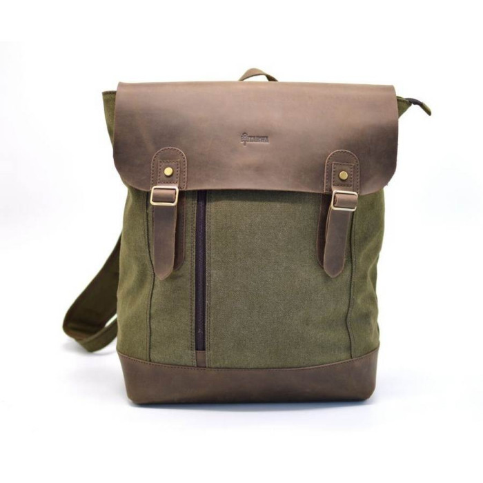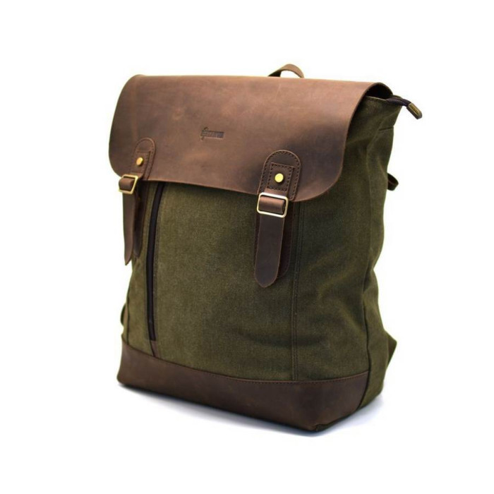 Молодіжний рюкзак городской на дві шлейки, парусина + шкіра RH-3880-3md від бренду TARWA. Виріб виконаний з дуже щільної тканини з елементами шкіряних вставок, і з клапаном з кінської шкіри, тканинної підкладкою. Усередині рюкзак має одне велике відділення, в якому є кишеня-роздільник з блискавкою під різні гаджети, і кишеню трохи менше для дрібних предметів, також з блискавкою, і дві накладних кишені. На лицьовій стороні аксесуара вертикальна блискавка-кишеню. Рюкзак застібається на блискавку і зверху накривається клапаном, має широкі зручні шлейки.