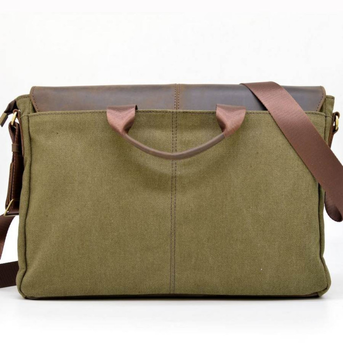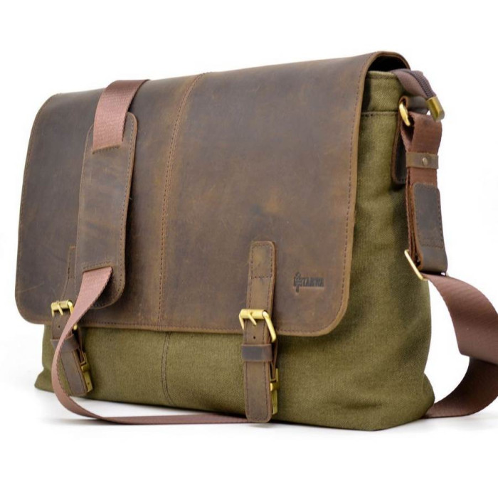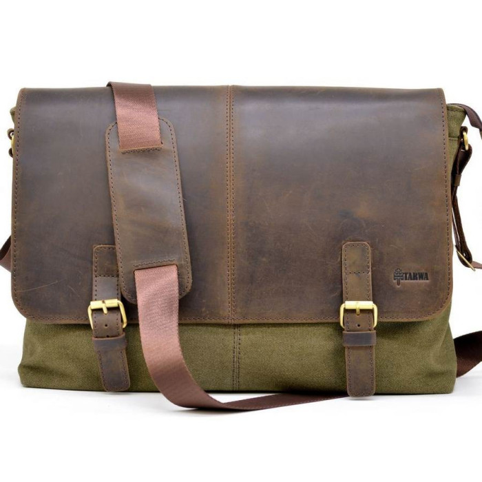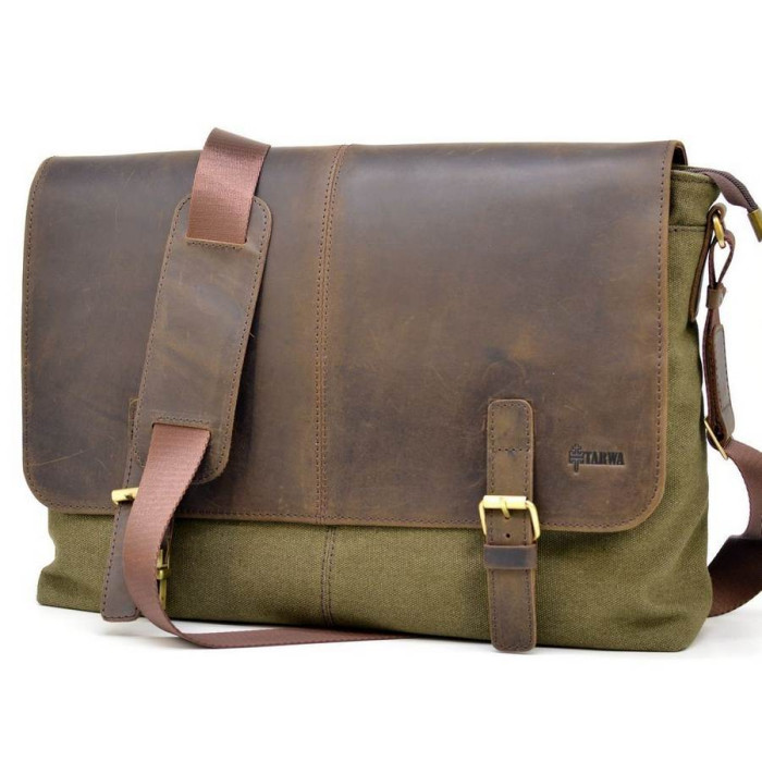Сумка через плече, мікс тканини канвас (парусина) плюс натуральна шкіра RH-8336-4lx TARWA. Вміщує формат А4 і невеликий ноутбук до 14 ". Аксесуар стане в нагоді як для студентів, так і для роботи. Виріб на одне основне відділення, всередині якого є два відсіки-перегородки: одна щільна, друга немає. Також, є всередині два великих відкритих кишені для смартфона і портмоне, і третій - врізна кишеня з блискавкою. Сумка застібається на блискавку і зверху ще накривається шкіряним клапаном з ремінцями і надійними портфельними застібками, завдяки чому промокання вмісту сумки під дощем виключається. на зовнішній стороні, під клапаном розташовується прихований плоский кишеню на всю ширину сумки. на задній стороні аксесуара також є кишеня-відсік на всю ширину вироби, з блискавкою. Сумка оснащена текстильним ременем з регулюванням довжини, з шкіряним наплічником.