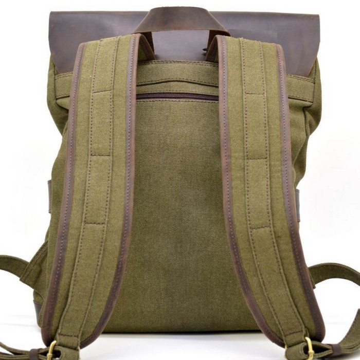 Універсальний рюкзак з парусини і шкіри RH-9001-4lx від українського бренду TARWA, підійде і хлопцям і дівчатам. Для ноутбука і документів, навчання і роботи, прогулянок і поїздок. Виріб пошито з дуже якісних матеріалів: щільна тканина парусина "Canvas" зі вставками натуральної телячої шкіри. Рюкзак складається з одного великого відділення, усередині якого розташовується ущільнений відсік для ноутбука або документів із застібкою на хлястик з липучкою. Всередині є пара накладних кишень для телефону і портмоне і місткий кишеню з блискавкою. На спинці рюкзака розташовується ще один кишеню з блискавкою. Зверху виріб накривається шкіряним клапаном з шкіряними ремінцями і магнітами, що захистить рюкзак від попадання дощу або снігу всередину. Лицьову сторону аксесуара прикрашає горизонтальний кишеньку з шкіряним клапаном на магнітних кнопках. На верхньому клапані присутній гравірування логотипу бренду. Рюкзачок має широкі, зручні шлейки, що дозволяють розподілити навантаження на всю спину.