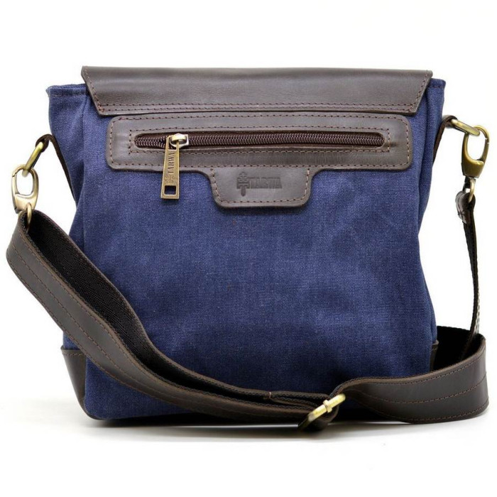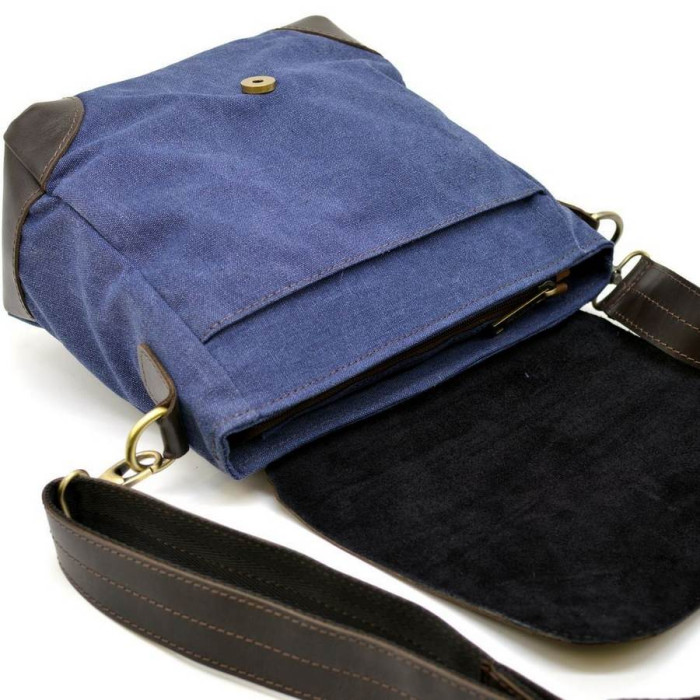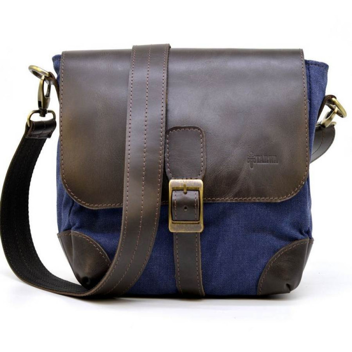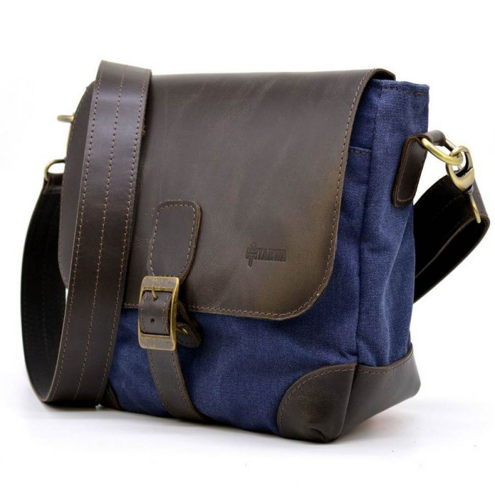 Компактна сумка-меседжер через плече виготовлена з міксу модною і сучасною тканини канваc і натуральної шкіри RK-1309-4lx від українського бренду TARWA. Ідеальне рішення на кожен день. Виріб складається з одного місткого відділення, всередині якого є дві відкритих кишені для телефону та інших дрібних предметів, а також є врізна кишеня з блискавкою для цінних речей. Сумка застібається на блискавку і зверху накривається шкіряним клапаном з ремінцем і магнітом. Під клапаном ховається великий плоский відкритий кишеню. На задній стінці також є врізна кишеня на блискавки. У комплектацію сумки входить знімний регульований ремінь з шкіряним наплічником.