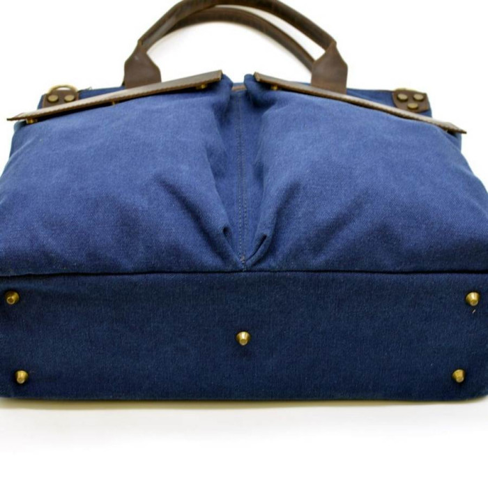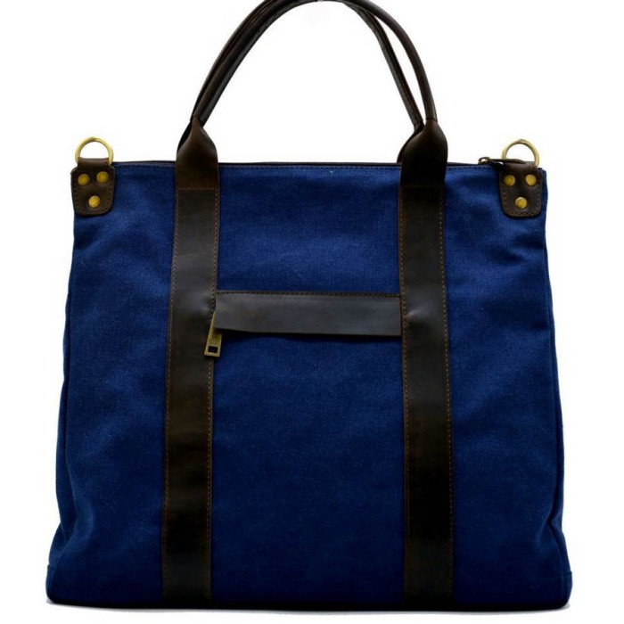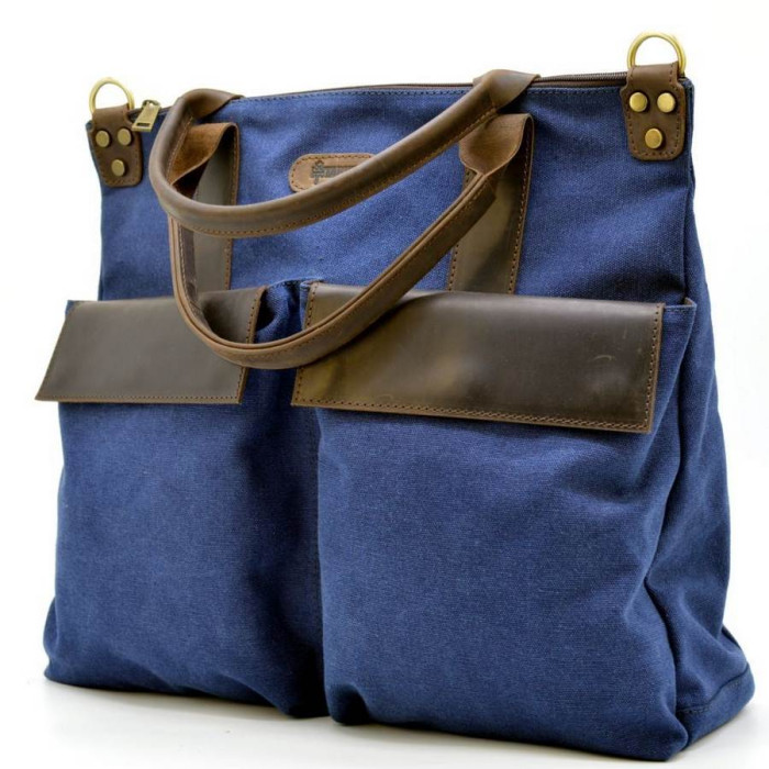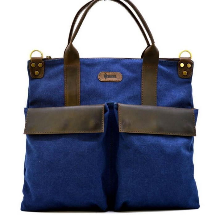 Повсякденна сумка від бренду Tarwa виконана в комбінації текстилю канвас і натуральної шкіри Crazy Horse, що надає виробу стильний і ексклюзивний дизайн. Головним акцентом сумки є два великих кишені на лицьовій частині. Кишені закриваються шкіряними клапанами і застібаються на три магніту кожен. Основне відділення складається: з великого відділення для ноутбука, кишені на блискавці і двох кишень для дрібних речей і аксесуарів. З тильного боку розташована кишеня з тонким клапаном на блискавці. Якісна і надійна фурнітура в бронзовому кольорі. Підклад з практичного і ідеально підібраного текстилю. Є регульований текстильний ремінь, що дає можливість для носіння на плечі.