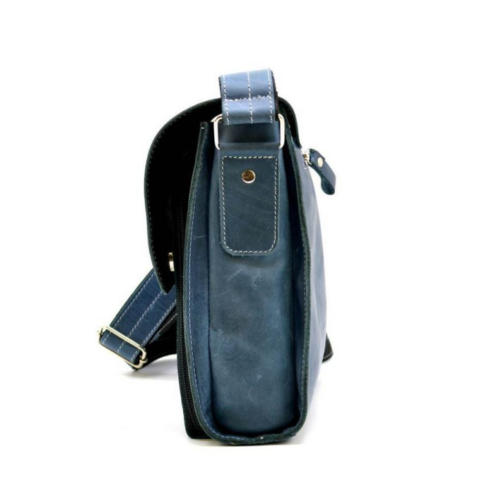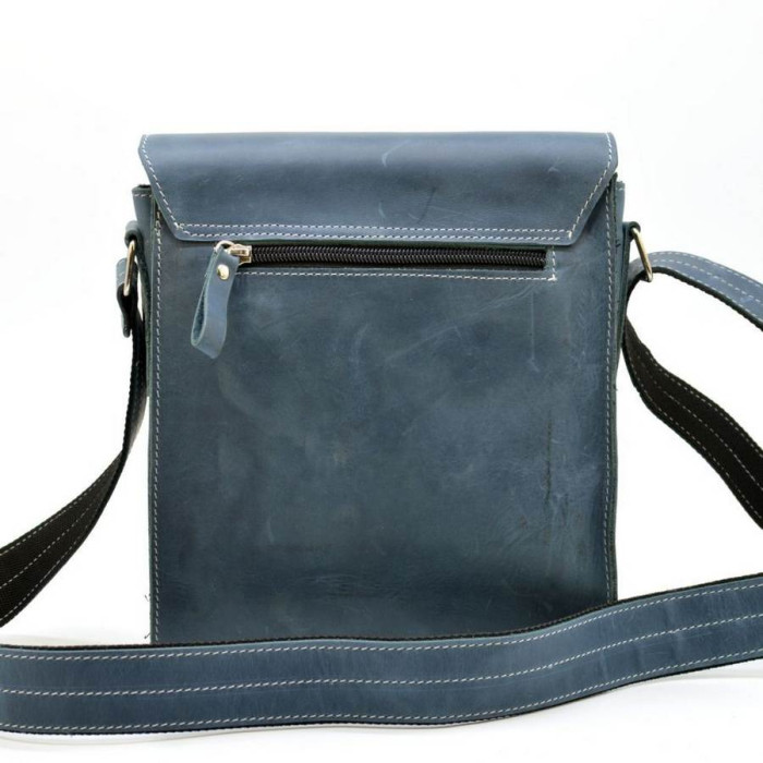 Функціональна сумка для повсякденного носіння для чоловіків. Аксесуар має одне основне відділення, всередині якого є кишеня на блискавці для документів і ще два маленьких відкритих кишені для всякої дрібниці. Сама сумка застібається на блискавку і зверху накривається клапаном з магнітною кнопкою. А під клапаном ховається дуже зручний і практичний відкидний кишені на блискавки з внутрішніми шкіряними відсіками, наприклад для пластикових карт або візиток. На задній стороні виробу знаходиться ще один кишені на блискавки. Сумка оснащена шкіряним регулюється ремінцем з текстильної основою, яка захищає від розтягування. Родзинку додає аксесуару матова світло-синя шкіра, вичинки crazy horse. Сумка буде чудово поєднується з джинсами і не тільки.