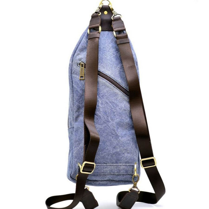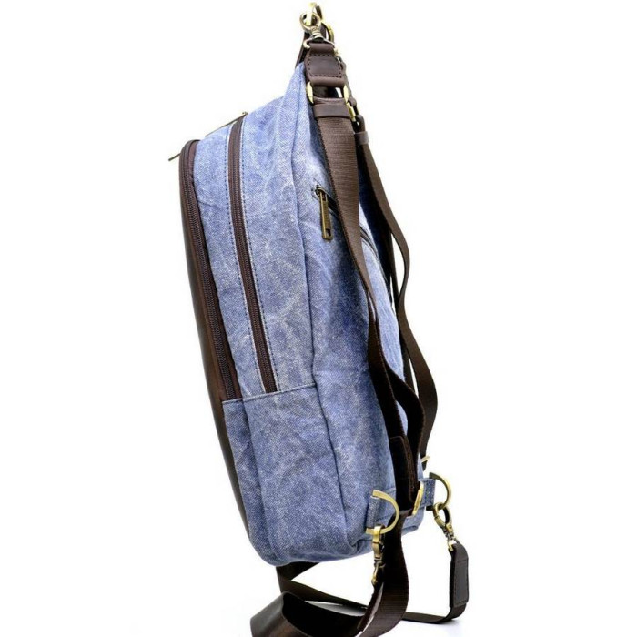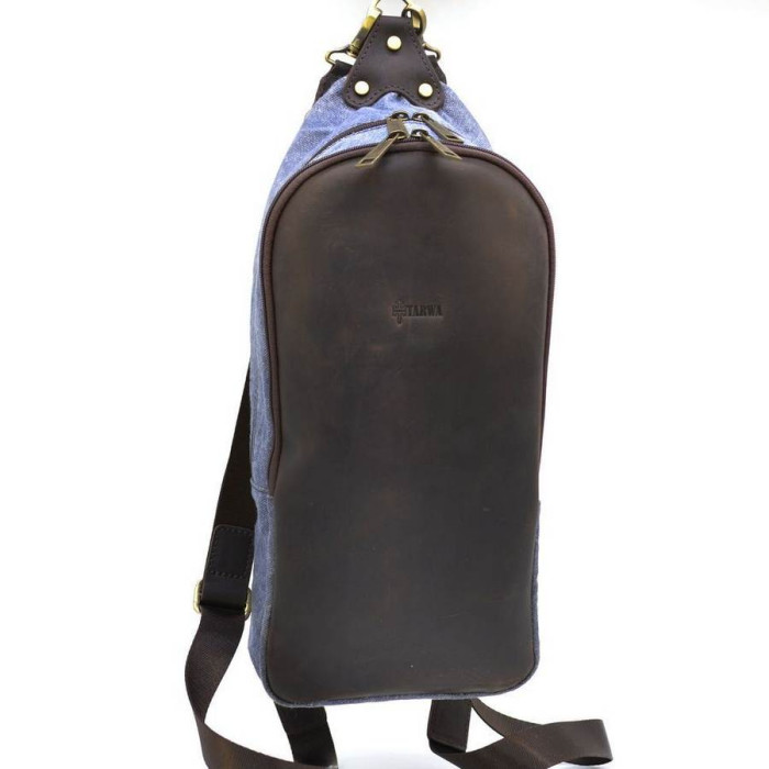 Рюкзак на одне плече, мікс тканини канвас і натуральної шкіри RKj-2017-4lx, від українського бренду TARWA. Виріб вміщує в себе всі необхідні речі, в тому числі планшет, телефони, документи, портмоне і багато іншого. Такий аксесуар буде зручний як на кожен день, так і для поїздок. Завдяки знімним шлейки, рюкзак можна носити на одне плече або як зазвичай - на дві шлейки. Строгі прямі лінії вдало підкреслюють стиль аксесуара. Лицьова сторона рюкзака повністю оброблена шкірою з логотипом бренду в центральній верхній частині. На задній стороні виробу є кишенька з косою блискавкою. Два відділення, застібаються кожне на окрему блискавку. Усередині більшого за розміром відділення, дві відкритих кишені, в меншій - один. Текстильна підкладка з щільної тканини. Текстильна шлейки з регулюванням довжини.