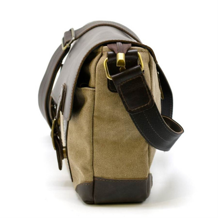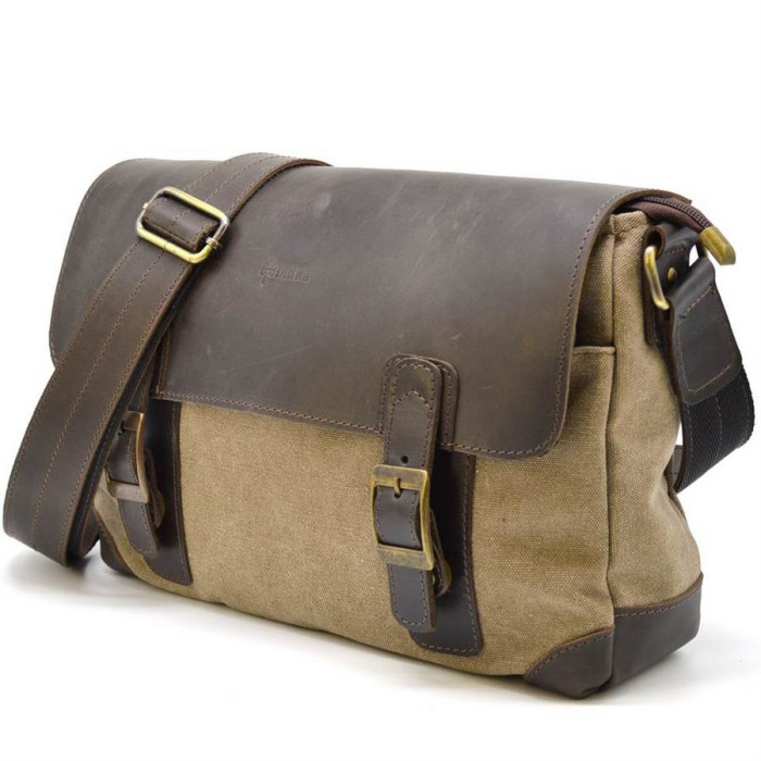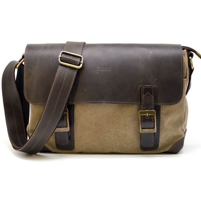 Чоловіча сумка через плече зі шкіри та тканини канвас (холщевка, парусина), виробник - український бренд TARWA. Сумка середнього розміру з шкіряним клпапаном з двома хлястиками. 33 * 22 * 8 см