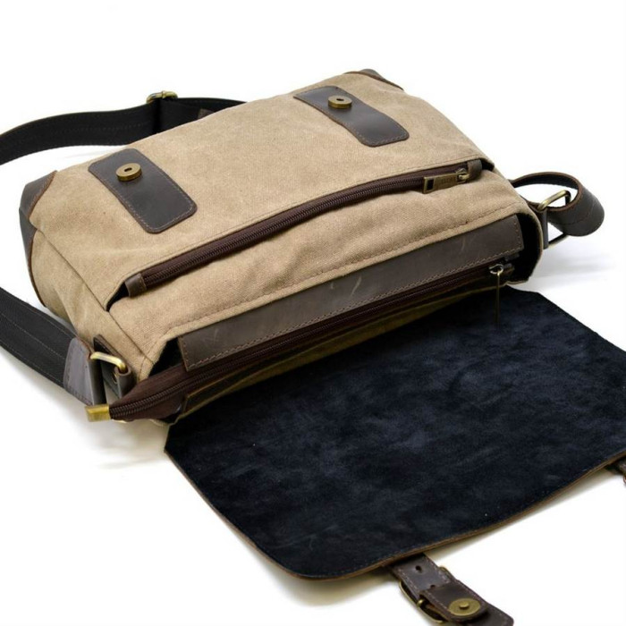 Чоловіча повсякденна сумка через плече зі шкіри та канвас, виробник - український бренд TARWA. Аксесуар має одне основне відділення з відсіком для документів або для інших важливих предметів, також має передній кишеню, який знаходиться під клапаном. Шкіряний ремінь регулюється по довжині.