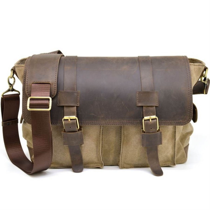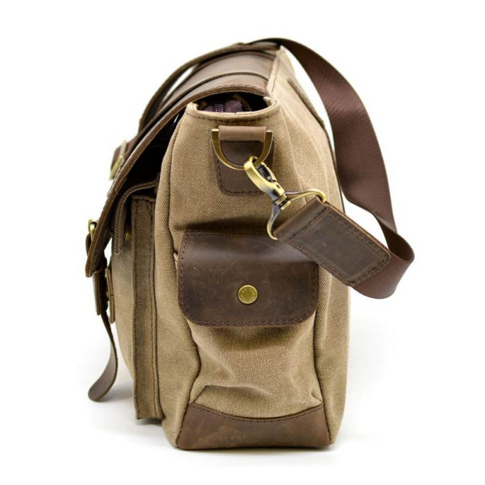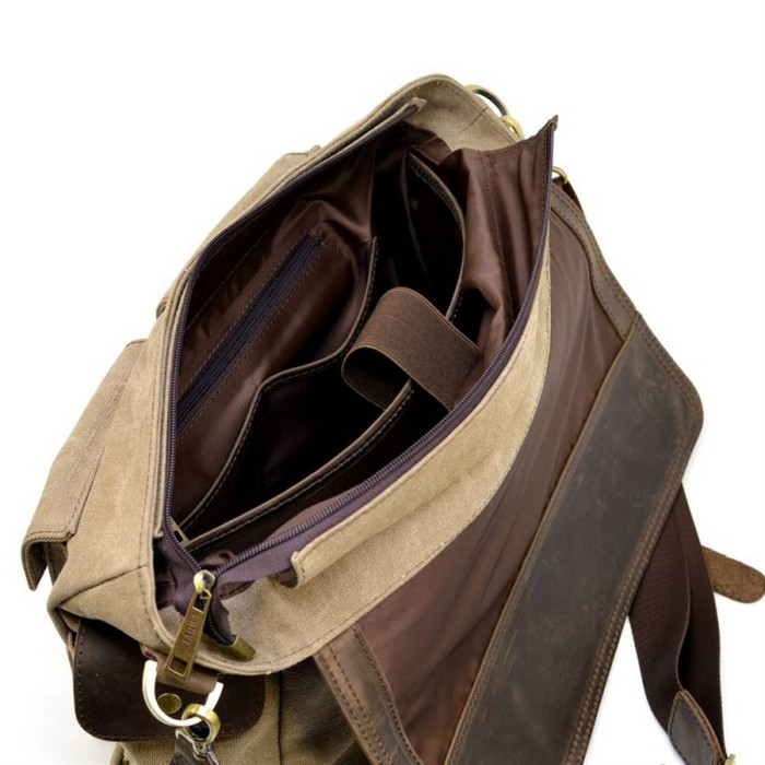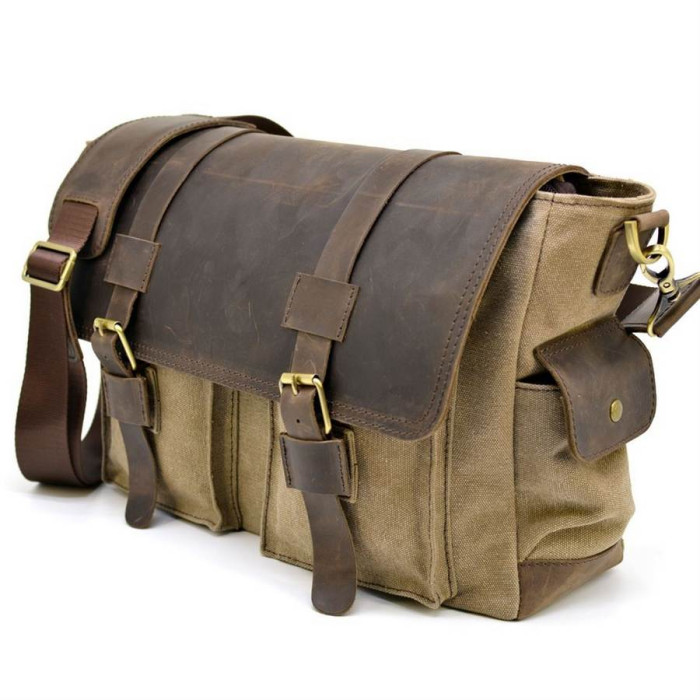 Сумка через плече з канвас і шкіри RSc-6690-4lx від українського бренду TARWA. Стильний аксесуар для чоловіків. Виріб має одне основне відділення, всередині якого додатковий відсік для ноутбука або планшета. Вміщує формат А4. Також, є два додаткових кишені, і ще один на блискавки. На задній стороні сумки присутній кріплення для ременя. На лицьовій стороні також є дві кишені, прикритих шкіряним клапаном. Торцеві сторони вироби оснащені двома кишенями з клапанами. Універсальна сумка, яка підійде, як і для повсякденного використання, так і для поїздки.