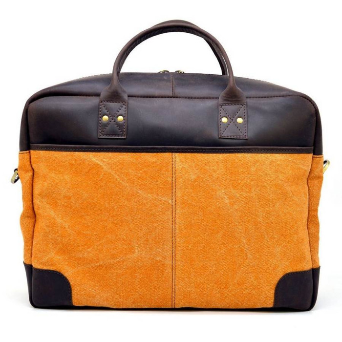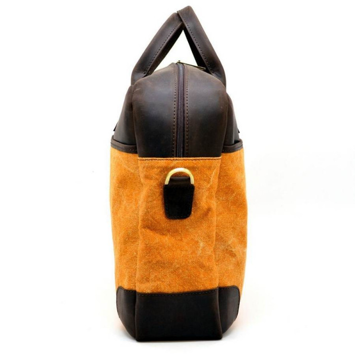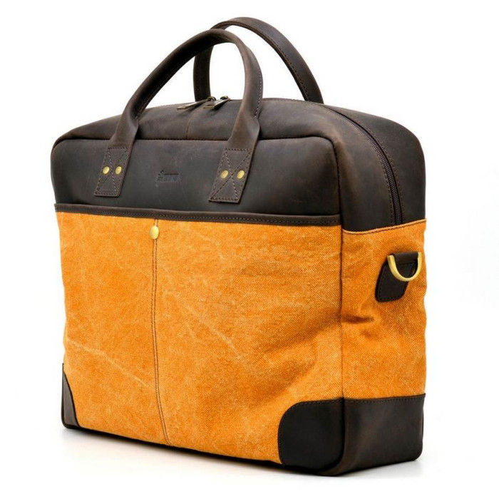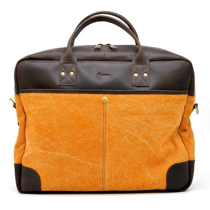 Велика сумка з двома ручками виготовлена з парусини і шкіри crazy horse RY-0458-4lx від українського бренду TARWA. Її можна носити в руці і на ремені через плече. Виріб має одну величезну відділення, усередині якого розташовується ущільнений відсік для ноутбука, також є два великих шкіряних кишені для телефону і портмоне і два тканинних відкритих. Ще є кишеня всередині з блискавкою. Зовні сумка оснащена по обидва боки кишенями з блискавкою, вміщають формат А4. Аксесуар має шкіряне уплоненное дно з металевими ніжками. Сумку можна використовувати для повсякденного носіння і відряджень, тому що вона досить містка, і Ви зможете розмістити в ній всі необхідні речі.