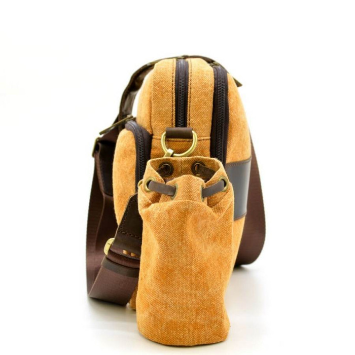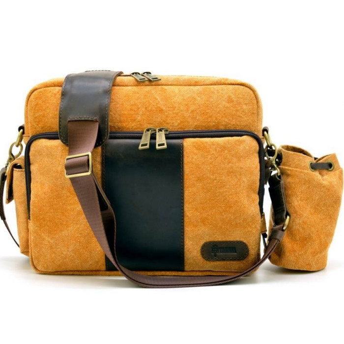 Унікальна сумка з парусини з шкіряними елементами RY-1092-4lx від українського бренду TARWA. Дуже стильний аксесуар для чоловіків і жінок на кожен день! Модель для повсякденного носіння виготовлена в комбінації тканини парусини (канвас) і натуральної шкіри Crazy Horse, що надає виробу особливий стиль. Лицьова сторона аксесуара прикрашена шкіряною смугою і брендом виробника. Також варто відзначити, наявність знімного утримувача під термо-чашку або маленьку пляшку з водою, який кріпиться збоку на торці сумки. З іншого боку є виступаючий кишеню для маленького телефону, окулярів або ключів. Велика зовнішня відкидний кишеню відрізняється своєю функціональністю - безліч кишеньок під пластикові карти, візитки та інші дрібні предмети. Виріб складається з двох відділень, застібаються на окремі блискавки. В основному, більшому по-розміром відділенні, розташовується ущільнений відсік з липучкою під планшет. В іншому - є врізна кишеня з блискавкою. Сумка оснащена текстильним ремінцем зі шкіряним наплічником для носіння через плече.