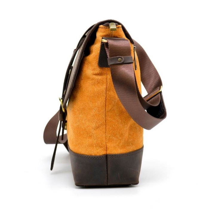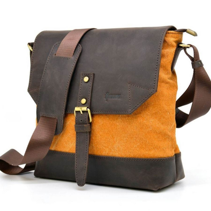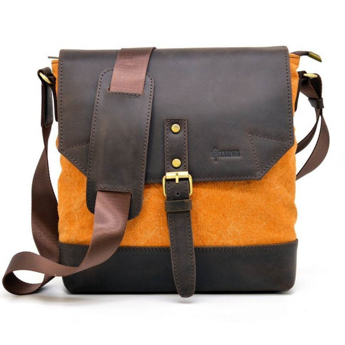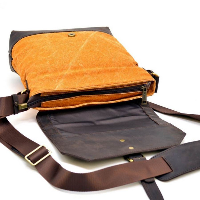 Яскрава сумка-месенджер через плече, мікс помаранчевої тканини канвас і коричневої натуральної шкіри RY-1307-4lx від українського бренду TARWA. Повсякденний компактний варіант. Виріб складається з одного відділення, всередині якого розташовуються два відкритих кишеньки для телефону та інших дрібних предметів, а також є врізна кишеня з блискавкою для цінних речей. Сумка застібається на блискавку і зверху накривається шкіряним клапаном з ремінцем і магнітом. Під клапаном знаходиться великий плоский відкритий кишеню. На задній стінці також є врізна кишеня на блискавки. У комплектацію сумки входить знімний регульований ремінь з шкіряним наплічником. Фурнітура фірмова, відрізняється високою якістю.