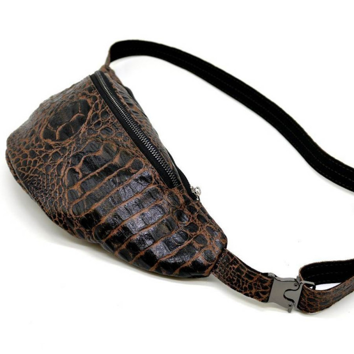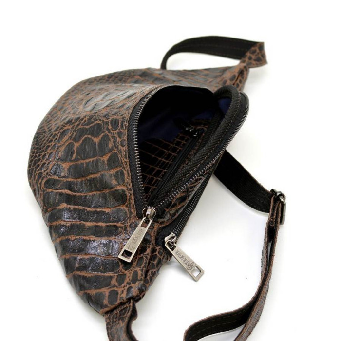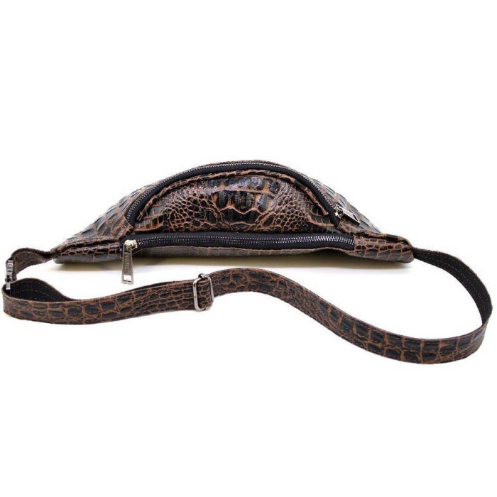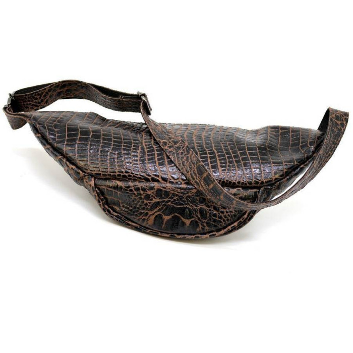 Напоясна сумка RP2-3036-3md від українського бренду TARWA виконана зі шкіри "крокодил". Зручна і містка модель як для поїздок, так і на кожен день для зберігання грошей, документів, телефону та іншого. Дана модель може бути цікава як для чоловіків, так і для дівчат. Виріб складається з двох відділень і внутрішньої кишені на блискавці в одному з них, більш великому. Напоясний ремінь складається з шкіри і щільного текстилю, що досить зручно при носінні. Всередині підкладка з міцної тканини. Використана якісна металева фурнітура: фастекс (застібка), блискавки, фіксатор регулювання ременя.