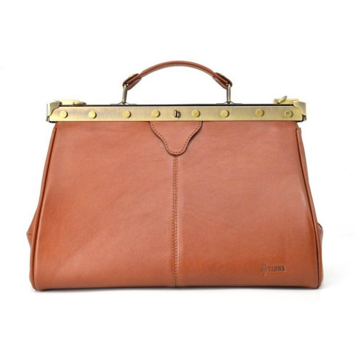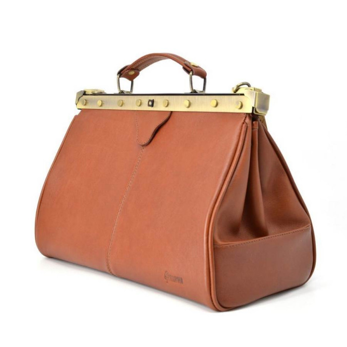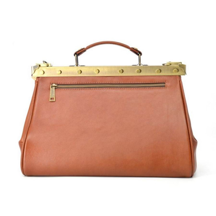 Сумка саквояж виготовлений з натуральної телячої шкіри. Закривається саквояж рамкової планкою з двома засувками з боків. Складається з двох однакових за розміром відділень, які розділяє плоский кишені на блискавки. Є один кишені на блискавки зовні і всередині, а також невеликий 1 кишеню і 2 маленьких, виконаних зі шкіри для дрібних аксесуарів. Є довгий регульований плечевий ремінь, що забезпечує комфорт пересування в подорожі або бізнес поїздку.