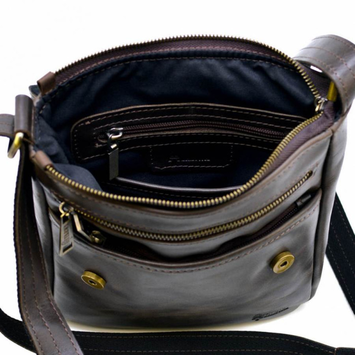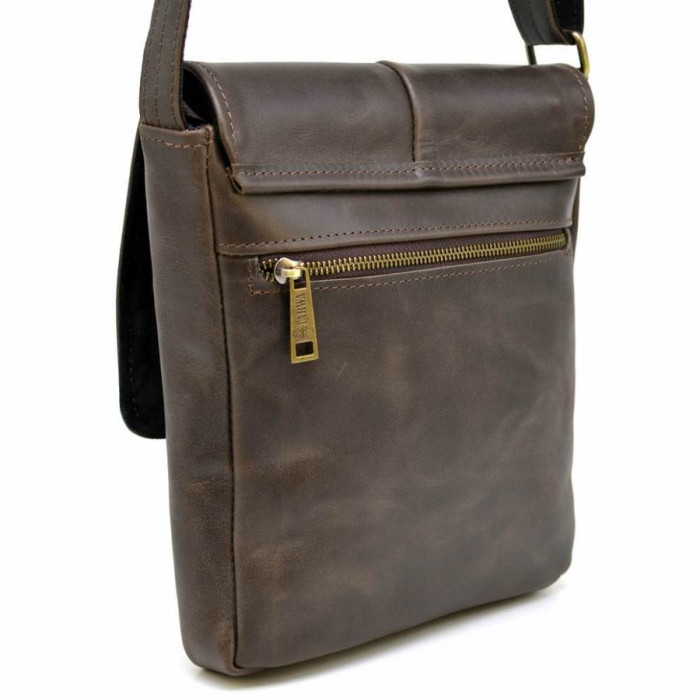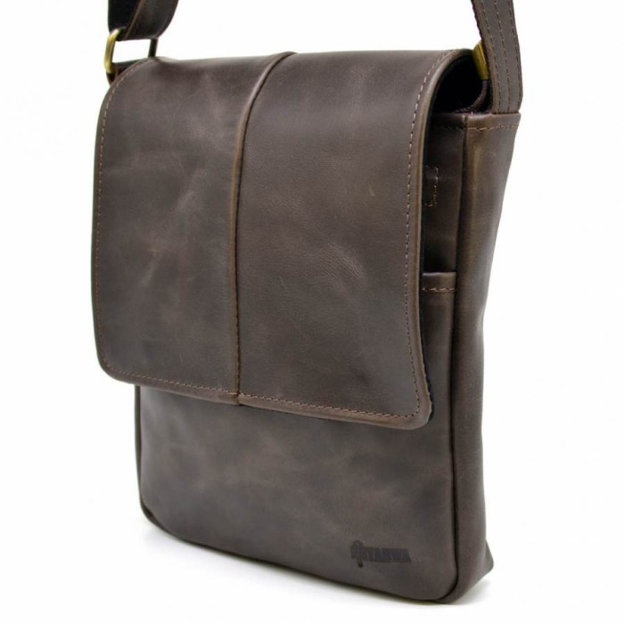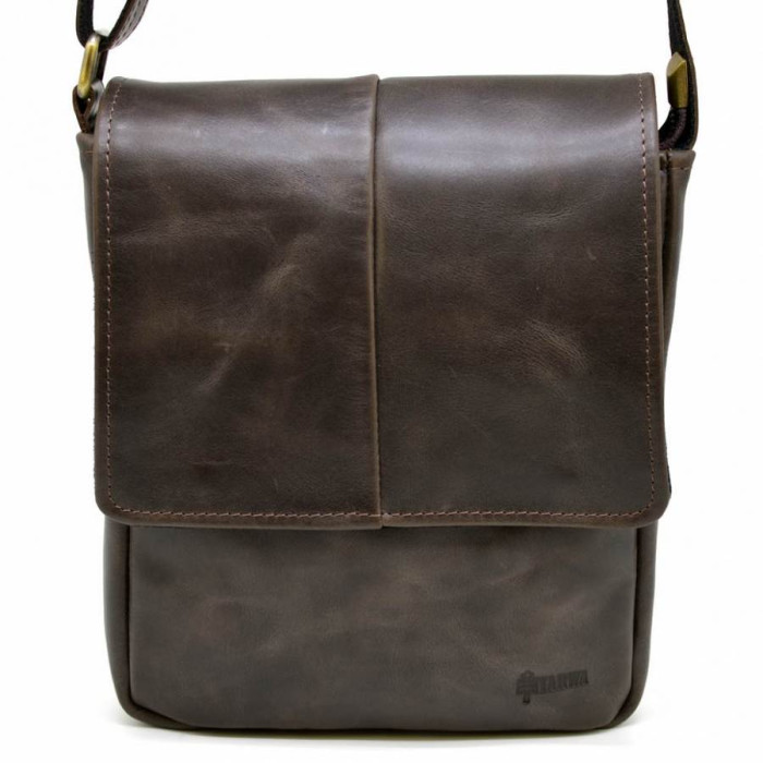 Красива чоловіча сумка через плече TC-1301-3md від українського бренду TARWA. Модель може вміщати документи формату А5, планшет. Виріб виготовлено з натуральної кінської шкіри, екстра-класу. Сумка складається з одного відділення, застібається на блискавку, і зверху накривається шкіряним клапаном, з магнітною кнопкою. Всередині є кишені: дві відкритих кишені і одна врізна на блискавки, для дрібних предметів. На лицьовій стороні сумки розташовуються дві кишені з блискавками, вони ховаються під клапаном. На задній стороні є врізна кишеня на блискавки. Аксесуар зручно носити на плечі завдяки регулюється плечевого ременя.