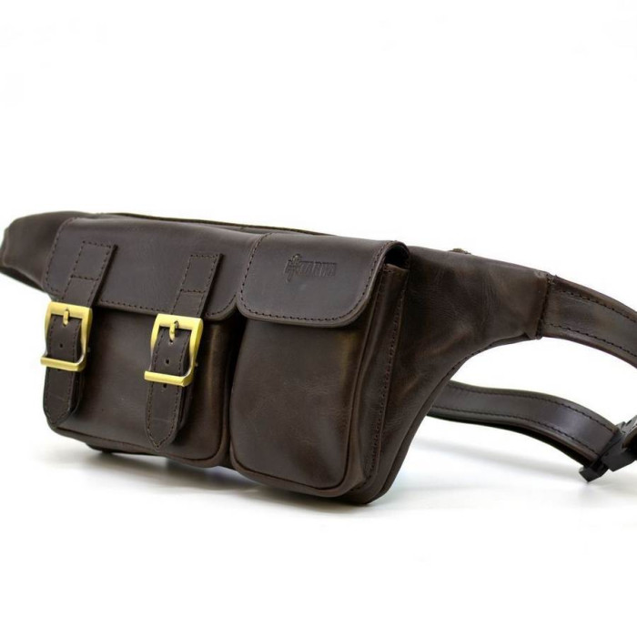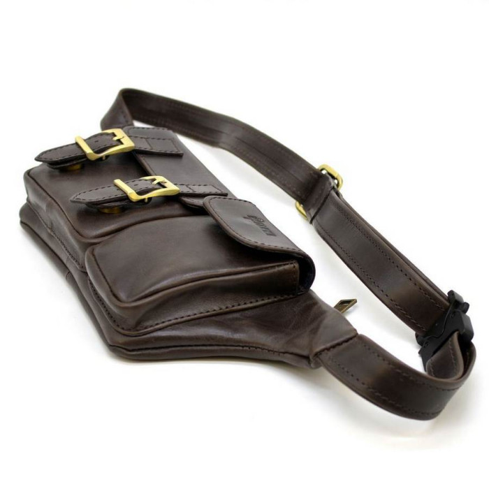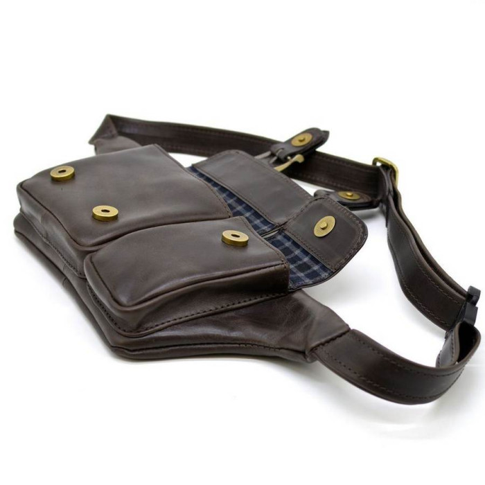Напоясна сумка з натуральної телячої шкіри, незвичайної форми TC-3029-4lx TARWA. Завжди корисний і затребуваний аксесуар на кожен день або в поїздку. У такій сумці Ви з легкістю зможете розмістити пару телефонів, портмоне, ключі та особисті документи. Виріб складається з одного плоского відділення, застібається на блискавку з врізною кишенею усередині з блискавкою. Красиво виглядають на лицьовій зовнішній стороні два об'ємних кишені різного розміру. Застібаються клапанами з магнітними кнопками. Ремінь регульований і повністю виконаний зі шкіри, а фастекс (застібка) металевий.