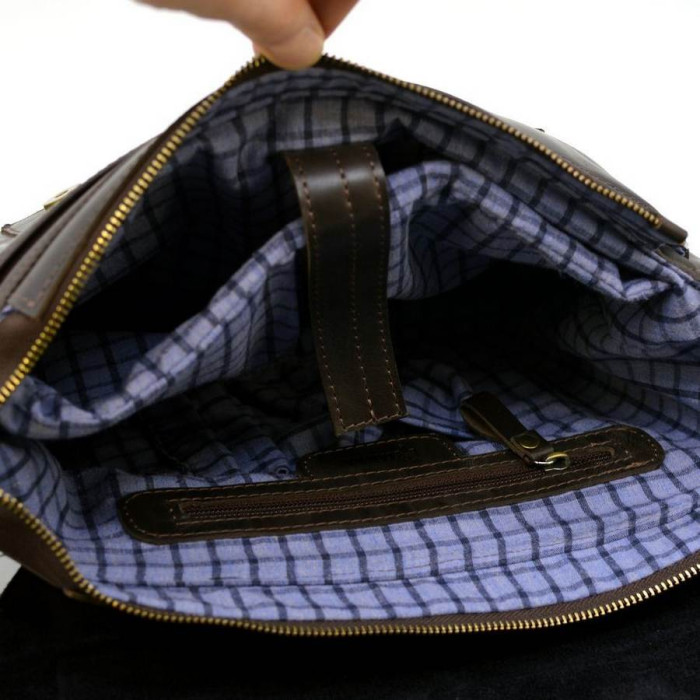Сумка має одне основне відділення з додатковим відсіком для планшета, ноутбука до 13 дюймів. Також є кишеня на блискавці і два невеликих кишені для різних дрібниць. Спереду розташована велика кишеня на блискавці, який накривається шкіряним клапаном на металевих замках. На задній частині сумки, відділення на блискавці. Шкіряний ремінь через плече регулюється, що дозволяє підібрати зручне положення. Надійна вінтажна фурнітура кольору бронзи.