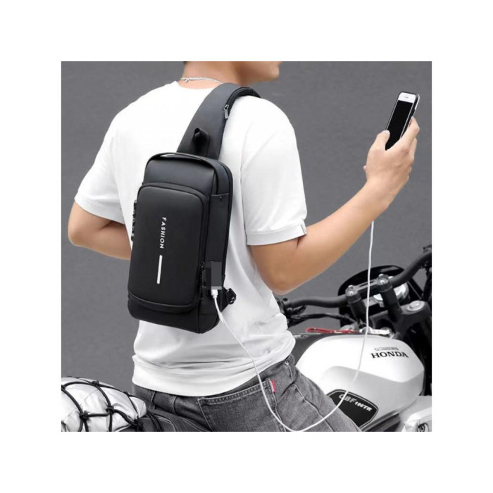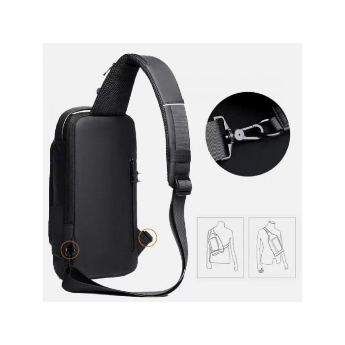 Особливістю даної моделі є кодовий замок, який блокує блискавку основного відділу. Також слінг має роз'єм для проводу USB, що дозволяє зручно заряджати телефон, не ховаючи його в сумку.
