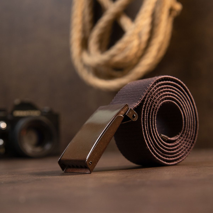 Тканинний чоловічий ремінець на кожен день насиченого коричневого кольору. Виріб довговічний. Тканина тягнеться. Доповнено ремінь якісною пряжкою з щільного сплаву прямокутної форми і автоматичного типу. Ви можете підібрати під ремінь подарункову коробку на нашому сайті. Ширина ременя середня і добре підійде під джинси і брюки. Текстильний ремінець стане непоганою альтернативою шкіряного ременя.