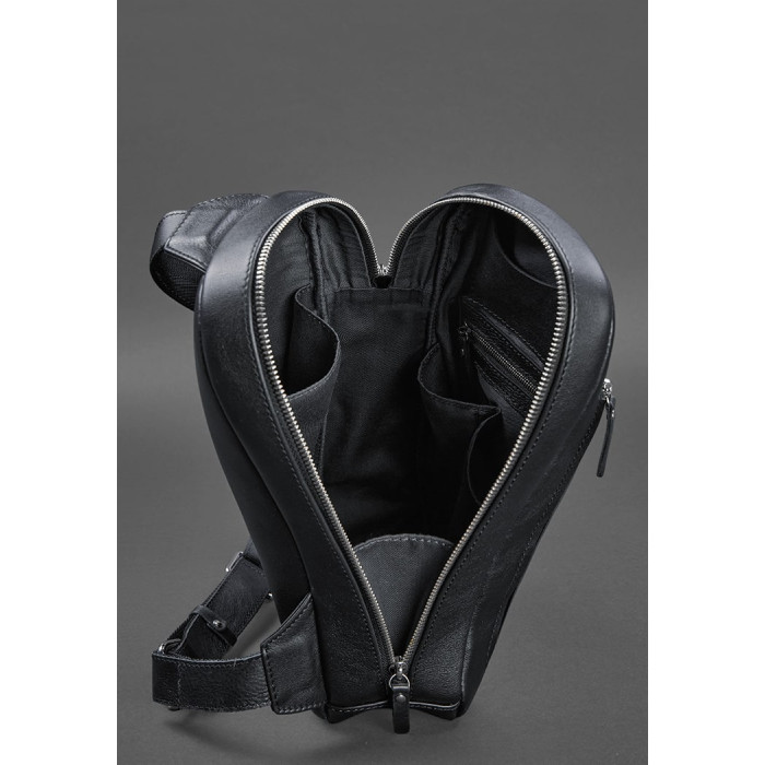 Сумка-слінг має одне відділення, яке закривається на блискавку. Усередині є декілька кишень для дрібниць і одна зовнішня кишеня на передній стінці рюкзака.